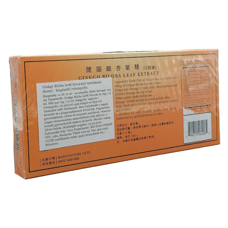Tartalma: 10 db méhpempős Ginkgo biloba kivonat. Felhasználása: Az első osztályú Ginkgo levél kivonatot tartalmazó ivóampulla mind önmagában fogyasztva, mint teába keverve, segít a szellemi teljesítőképességünk fokozásában. Adagolás: naponta 1-2 ampulla elfogyasztása, reggel vagy este.