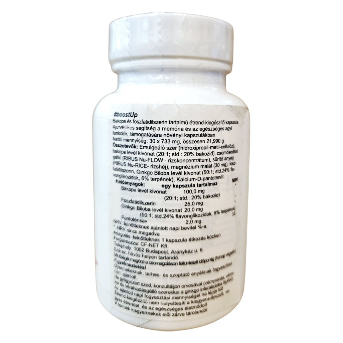 A Calivita #boostUp étrend-kiegészítő kapszula bakopa és foszfatidilszerin tartalmával készült, amely ayurvédikus segítséget nyújthat a memória és az egészséges agyi funkciók támogatására. A termék 30 kapszulát tartalmaz, melyek mindegyike 733 mg-os. Az összetevők között megtalálható a Ginkgo Biloba levél kivonat és a Kalcium-D-pantotenát is. A termék kizárólag természetes alapanyagokból készül, és a legszigorúbb gyártási feltételek mellett állítják elő. A termék forgalmazója a CF-NET Kft., székhelye Budapest, Aranykéz u. 6. A kapszulák fogyasztása nem ajánlott gyermekeknek, terhes és szoptató anyáknak, valamint gyógyszerszedés esetén orvosi konzultáció javasolt.