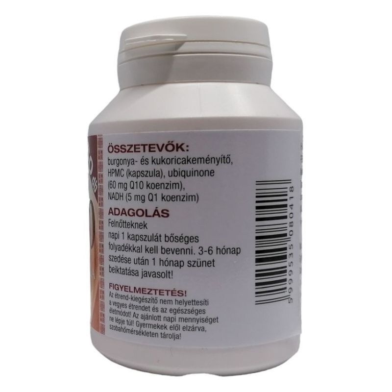 Elősegíthetik a normális vérnyomás megtartását, segíthetnek, ha aktívabb életet szeretne élni. Hazai szakemberek által fejlesztett étrend-kiegészítő. Összetevők: burgonya- és kukoricakeményítő, cellulóz (kapszula), ubiquinone (60 mg Q10), NADH (5 mg Q1). Adagolás: Felnőtteknek napi 1 kapszulát bőséges folyadékkal ajánlott bevenni. 3-6 hónap szedése után 1 hónap szünet beiktatása javasolt! Figyelmeztetés: Az étrend-kiegészítő nem helyettesíti a vegyes étrendet és az egészséges életmódot! Az ajánlott napi mennyiséget ne lépje túl! Gyermekek elől elzárva, szobahőmérsékleten tárolja!