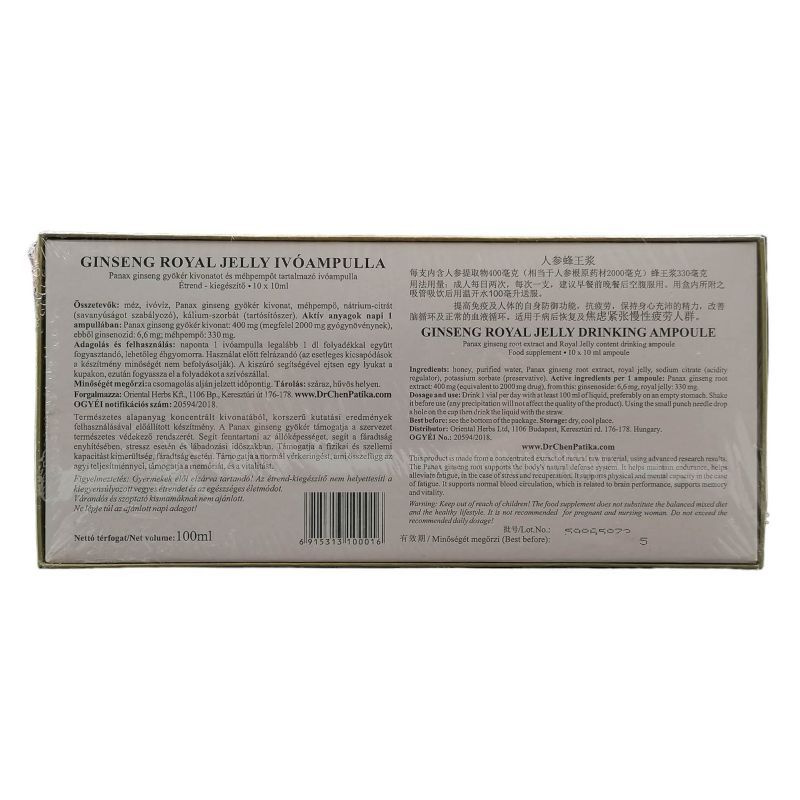 Figyelmeztetés: Gyermekek elől elzárva tartandó! Az étrend-kiegészítő nem helyettesíti a kiegyensúlyozott vegyes étrendet és az egészséges életmódot. Ne lépje túl az ajánlott napi adagot! Tartós alkalmazása esetén 1-2 hónaponként néhány napos szünet tartása javasolt. Terhes- és szoptatós anyáknak, vagy az összetevőkkel szembeni érzékenység esetén nem ajánlott. Adagolás (felhasználás): naponta 1 ivóampulla éhgyomorra. Összetevők: Panax Ginseng-gyökér kivonat (200mg/10ml), méhpempő (300mg/10ml), méz (8g/10ml), víz, benzoesav, szorbinsav (tartósítószer). Hatóanyagok a napi adagolásra napi 1 ampullára: ginsenozid: 4 mg.