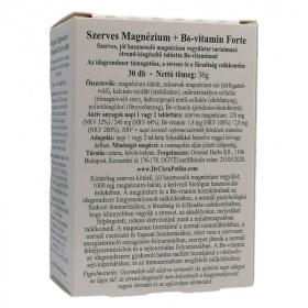 Az étrend-kiegészítő nem helyettesíti a kiegyensúlyozott vegyes étrendet és az egészséges életmódot. adagolás (felhasználás) naponta 1 tabletta folyadékkal lenyelve összetevők magnézium-laktát, térfogatnövelő: magnézium-sztearát, stabilizátor: kalcium-szulfát, tömegnövelő szer: mikrokristályos cellulóz, filmbevonó: HPMC, PEG, B6-vitamin (piridoxin-hidroklorid).