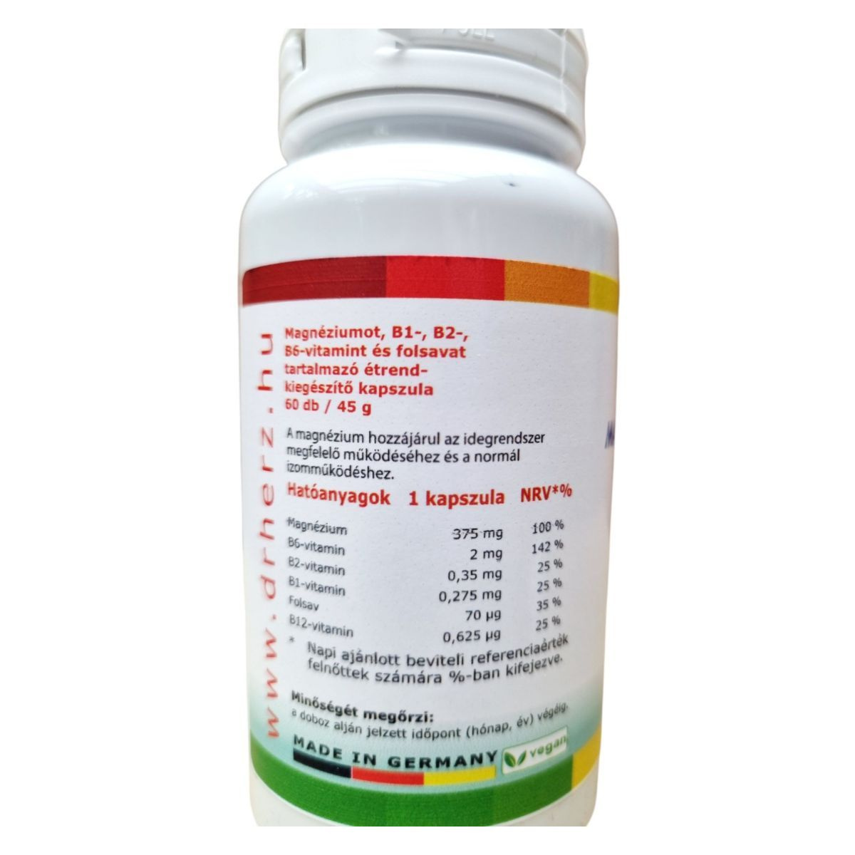 A Dr. Herz MAGNÉZIUM+B6 kapszula egy olyan étrend-kiegészítő, amely magnéziumot, B1-, B2-, B6-vitamint és folsavat tartalmaz. Ezek az összetevők hozzájárulhatnak az idegrendszer megfelelő működéséhez és a normál izomműködéshez. A termék vegán étrendbe illeszthető, és napi egy kapszula fogyasztása javasolt, főétkezés előtt, bőséges folyadékkal. Az étrend-kiegészítő nem helyettesíti a kiegyensúlyozott étrendet és az egészséges életmódot. A termék Magyarországon készül, és az OGYÉI által notifikált.
