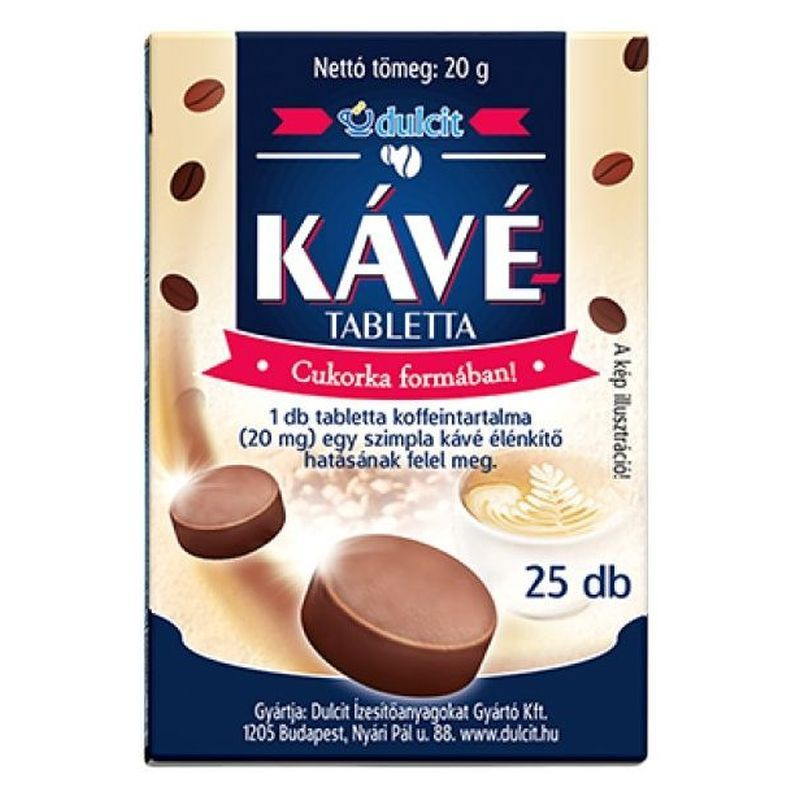 A kávétabletta egy szimpla kávé élénkítő hatásának felel meg. 1 db tabletta koffeintartalma 20 mg.