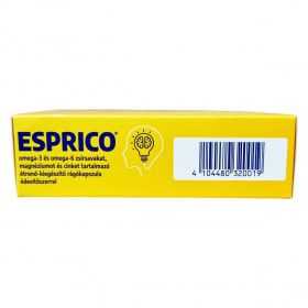 Az ESPRICO® gumírozott kapszulái gyümölcsízűek és többszörösen telítetlen zsírban gazdagok, tartalmaznak omega-3 és omega-6 zsírsavakat, mint a DHA, EPA és GLA. A termék nem tartalmaz tartósítószert, glutamátot, ftalátot, laktózt és glutént. A DHA dokozahexaénsav hozzájárulhat a normál agyműködés fenntartásához, a magnézium pedig az idegrendszer megfelelő működéséhez és a normál pszichológiai funkció fenntartásához. A cink hozzájárulhat a normál szellemi működés fenntartásához. A napi 4 kapszula bevitelével a termék töredékét biztosítja a javasolt 250 mg DHA napi mennyiségnek. Az ESPRICO® fogyasztása során fontos betartani az ajánlott adagolást, és tisztában lenni az allergén összetevőkkel, különösen hal és szójaallergia esetén.