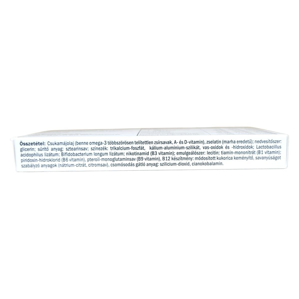 Csukamájolaj (benne omega-3 többszörösen telítetlen zsírsavak, A- és D-vitamin), zselatin (marha eredetű), glicerin, sztearinsav, trikalcium-foszfát, kálium-aluminium-szilikát, vas-oxidok és -hidroxidok, Lactobacillus acidophilus lizátum, Bifidobacterium longum lizátum, nikotinamid (B3 vitamin), lecitin, tiamin-mononitrát (B1 vitamin), piridoxin-hidroklorid (B6 vitamin), pteroil-monoglutaminsav (B9 vitamin), B12 készítmény (módosított kukorica keményítő, nátrium-citrát, citromsav, szilicium-dioxid, cianokobalamin)