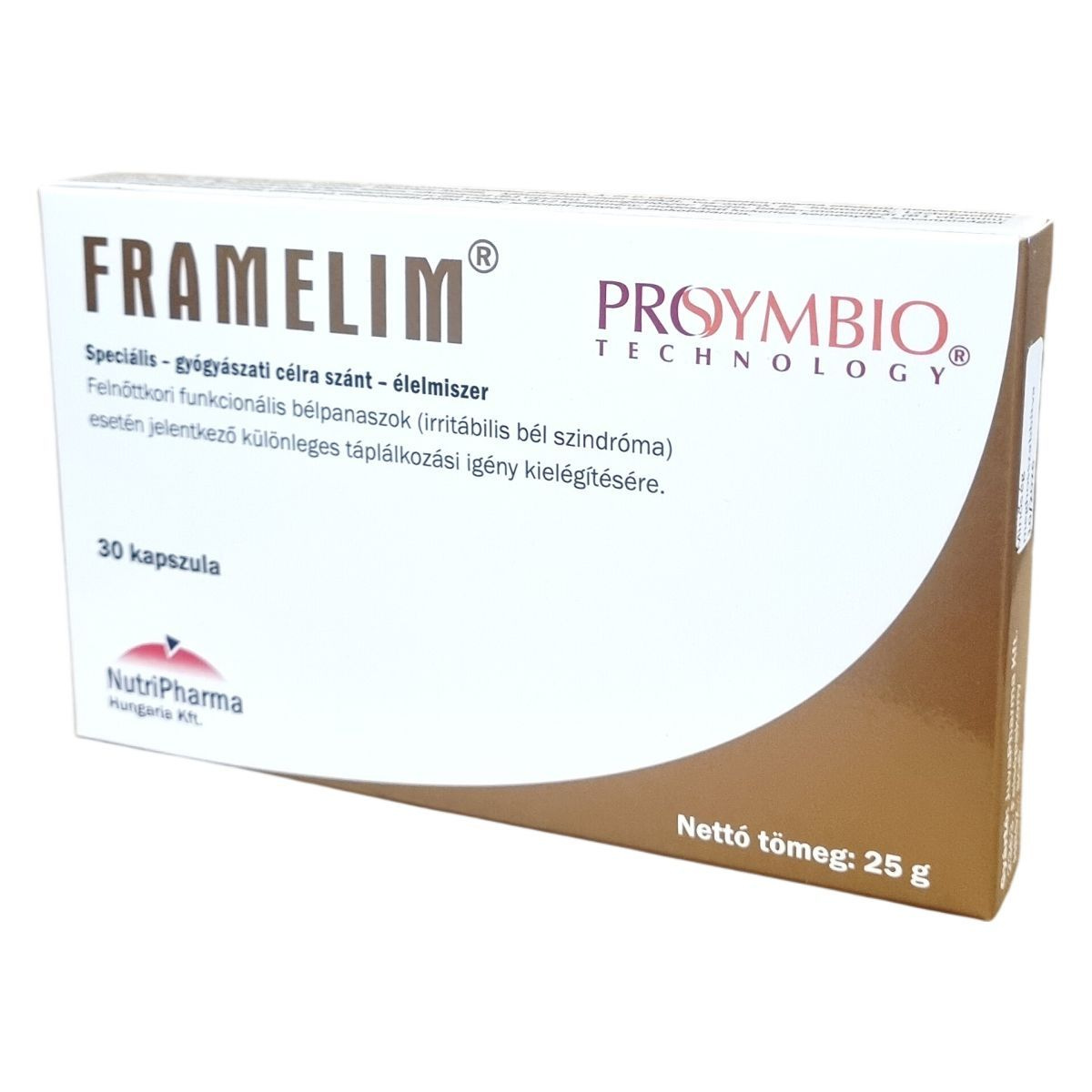 A Framelim® ProSymbio® speciális gyógyászati célra szánt élelmiszer, mely felnőttkori funkcionális bélpanaszok, például irritábilis bél szindróma esetén jelentkező táplálkozási igényekhez fejlesztett termék. A különleges formulában csukamájolaj található, amely gazdag omega-3 zsírsavakban, valamint A- és D-vitaminban. A készítmény baktérium lizátumokat tartalmaz Lactobacillus acidophilus és Bifidobacterium longum törzsekből, amelyek frakcionált hőkezeléssel készülnek. A kapszulák összetevői között szerepel továbbá több B-vitamin is, támogatva az anyagcsere folyamatokat. A termék nem használható önálló táplálékforrásként, és tejcukor-érzékenyek részére nem javasolt. Az adagolás napi három kapszula, legalább két hónapon át, az étkezés előtt vagy közben ajánlott. A tárolási feltételek között fontos a fénytől való védelem, a száraz környezet és a gyermekektől való elzárás. A készítményt orvosi ellenőrzés mellett szabad alkalmazni.