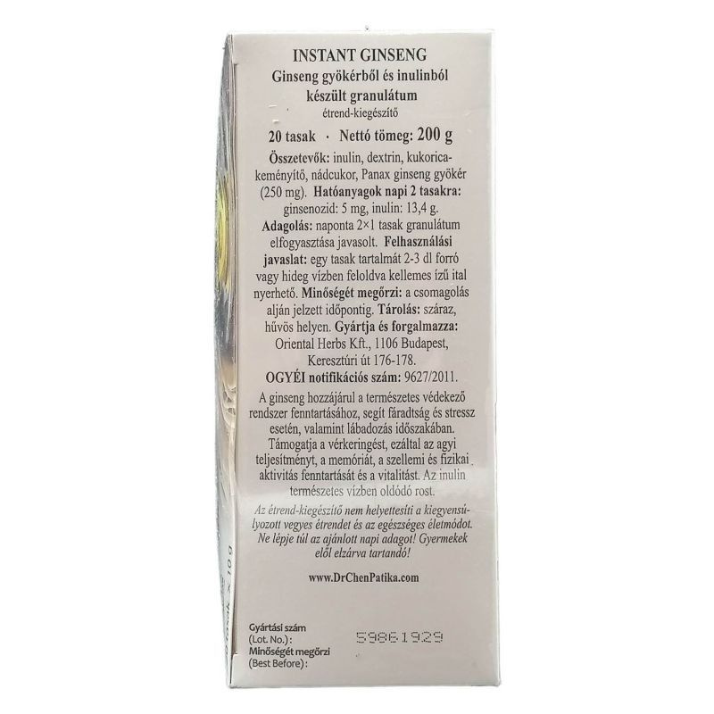A ginseng segít a szellemi és fizikai frissesség megőrzésében, támogatja az immunrendszert. Serkentőleg hat az egész szervezetre, mozgósítja annak energiáit. Betegségek utáni lábadozáskor hasznos kiegészítés. A forró és hideg vízben egyaránt feloldható instant tea az év minden szakában kellemes frissítő. Naponta 1-2 csésze tea fogyasztása javasolt.
