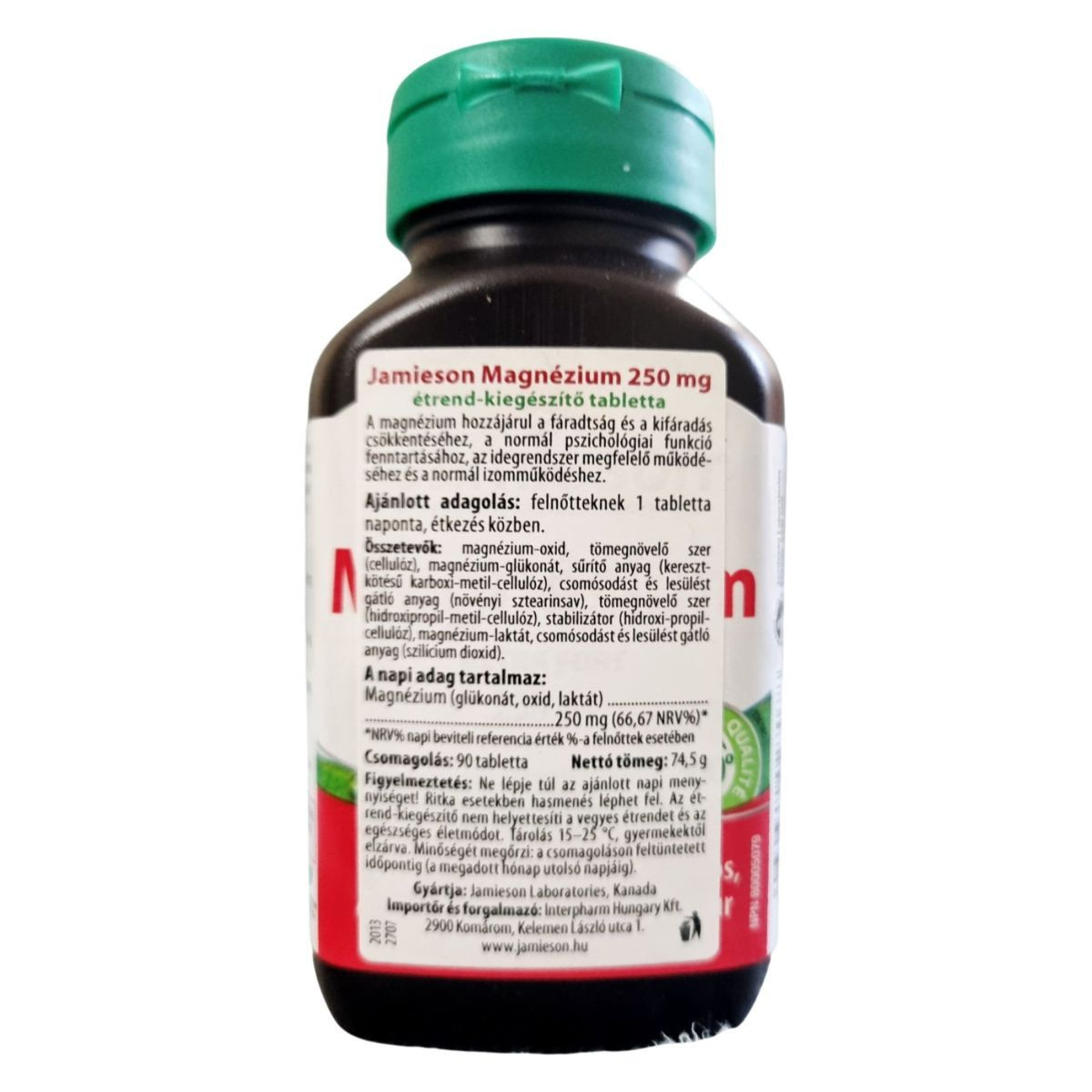 A Jamieson Magnesium 250 mg-os étrend-kiegészítő tabletta támogatást nyújthat a csontok, izmok és a szív egészségéhez. A termék vegetáriánusok számára is alkalmas, és nem tartalmaz cukrot, keményítőt, glutént, laktózt, mesterséges színezékeket, ízesítőket vagy tartósítószereket. A termék 90 tablettát tartalmaz, és a gyártó ajánlása szerint felnőttek számára napi egy tabletta fogyasztása javasolt étkezés közben. A termék minőségét a csomagoláson feltüntetett időpontig őrzi meg, és tárolása 15–25 °C között ajánlott, gyermekektől elzárva. A termék gyártója a kanadai Jamieson Laboratories, forgalmazója az Interpharm Hungary Kft.