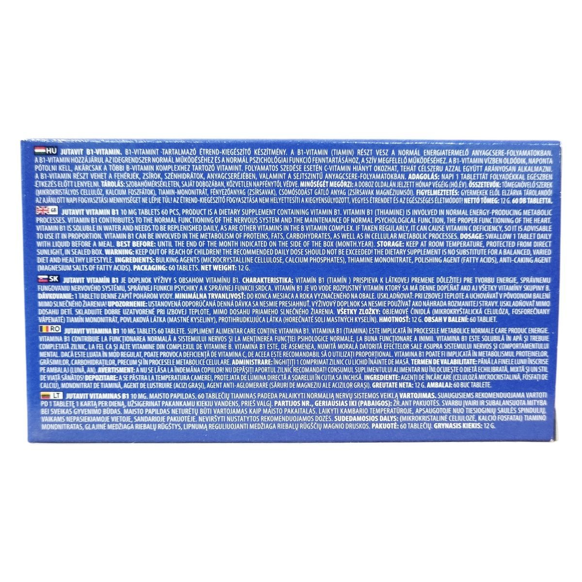 A JutaVit B1-vitamin 10 mg-os tabletta B1-vitamint (tiamint) tartalmazó étrend-kiegészítő készítmény, amely a normál energiatermelő anyagcsere-folyamatokban vehet részt. A B1-vitamin hozzájárulhat az idegrendszer normál működéséhez, a normál pszichológiai funkció fenntartásához és a szív megfelelő működéséhez. Vízhatlan vitamin, ezért naponkénti pótlása szükséges, akár a B-vitamin-komplex további összetevőivel együtt. A hosszú távú használat esetén C-vitamin hiány léphet fel, így javasolt a megfelelő arányban történő alkalmazásuk. A termék fehérjék, zsírok, szénhidrátok anyagcseréjében, valamint sejtszintű anyagcsere-folyamatokban is szerepet játszhat. A doboz 60 tablettát tartalmaz, nettó tömege 12 g.