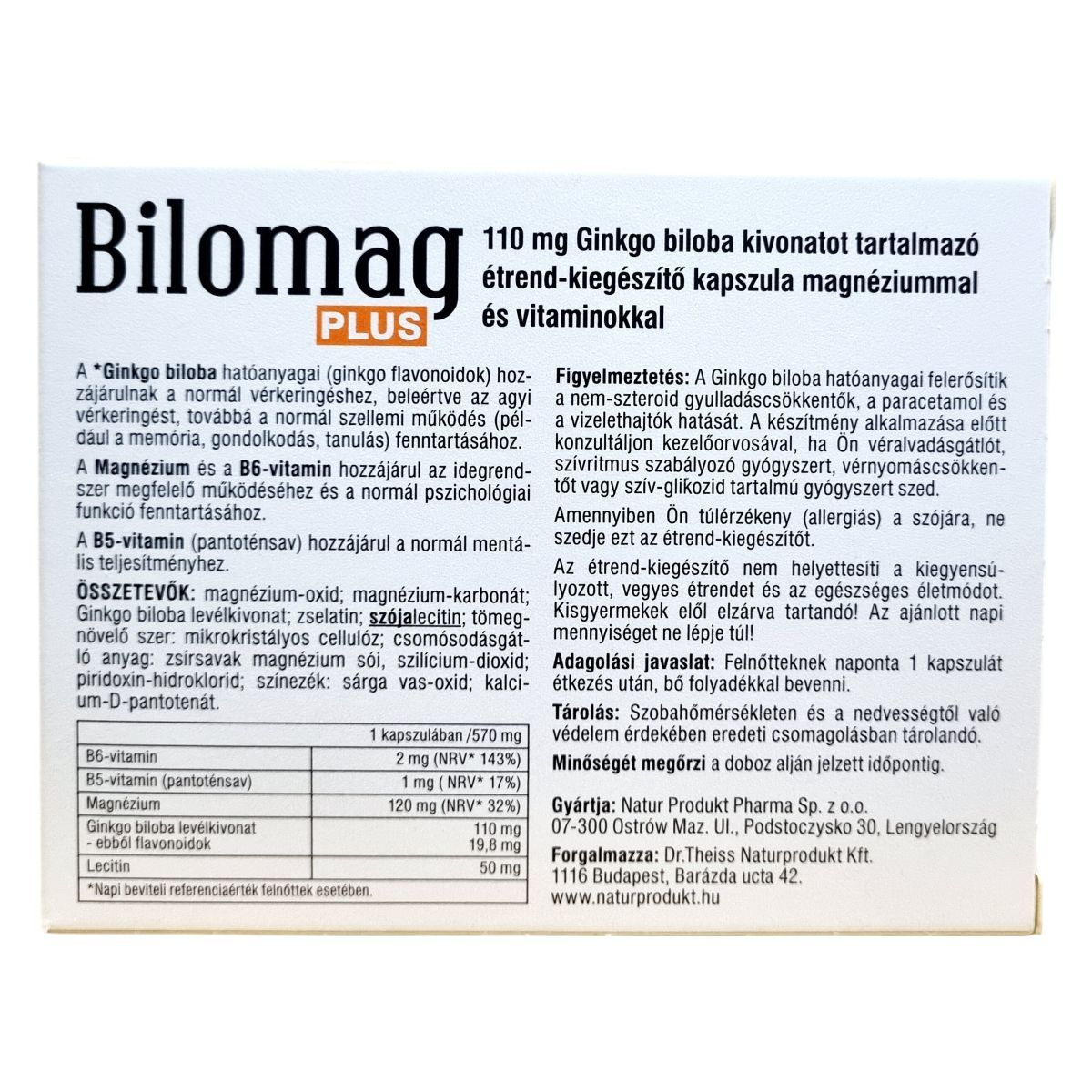 A Bilomag PLUS egy gazdaságos kiszerelésű étrend-kiegészítő, amely 110 mg Ginkgo biloba kivonatot, magnéziumot, B6- és B5-vitamint tartalmaz. A Ginkgo biloba hozzájárulhat a normál vérkeringéshez, beleértve az agyi vérkeringést, és támogathatja a normál szellemi működést, mint például a memória és a tanulás. A magnézium és a B6-vitamin segíthet az idegrendszer megfelelő működésében, míg a B5-vitamin hozzájárulhat a normál mentális teljesítményhez. A termék 90+30 kapszulát tartalmaz, amely ajándékként is szolgálhat. Fontos, hogy a termék alkalmazása előtt konzultáljon orvosával, különösen, ha gyógyszereket szed.