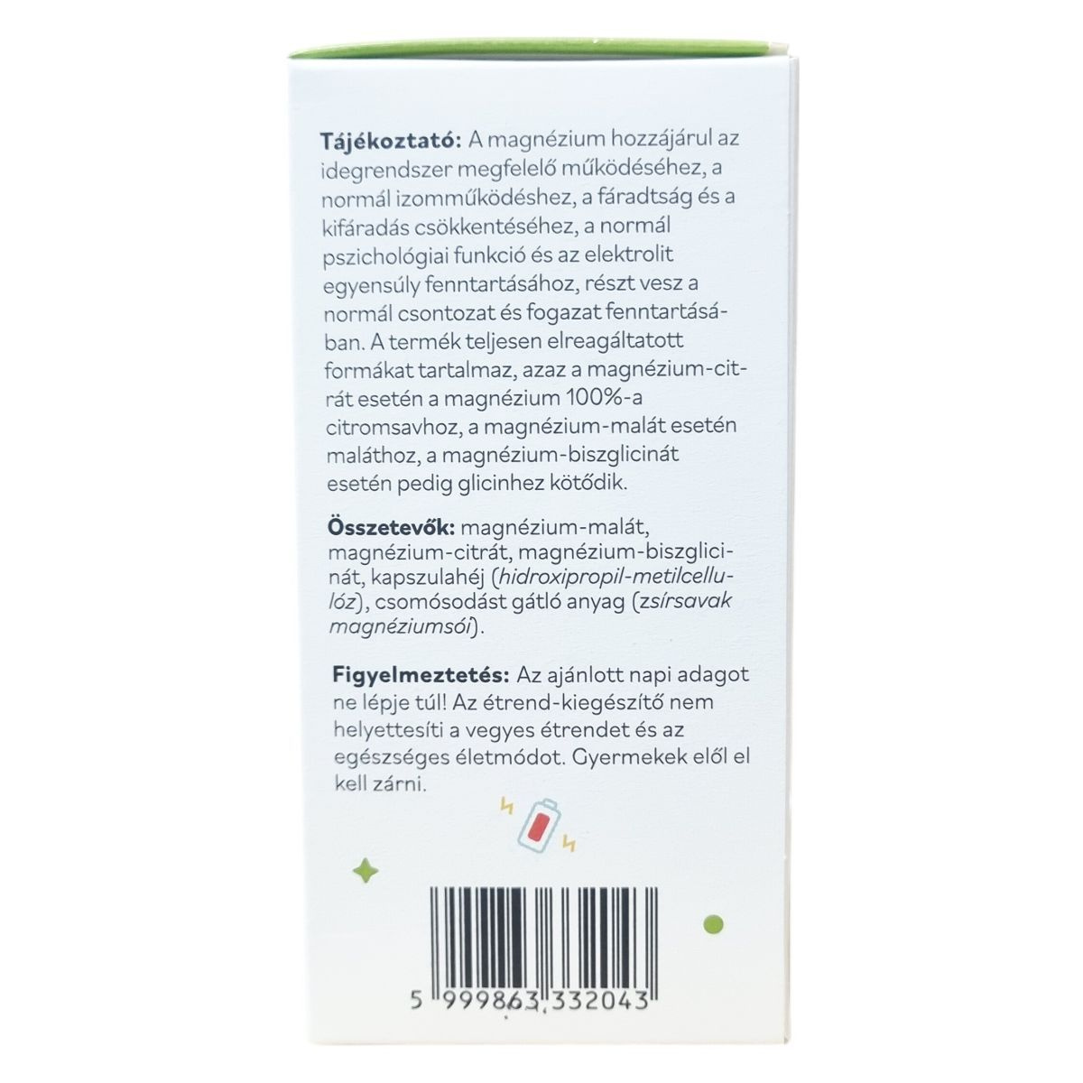 Magnézium 180 mg (magnézium-malátból, magnézium-citrátból és magnézium-biszglicinátból)