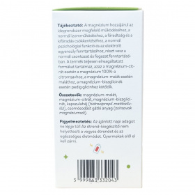 A magnézium hozzájárul az idegrendszer megfelelő működéséhez, a normál izomműködéshez, a fáradtság és a kifáradás csökkentéséhez, a normál pszichológiai funkció és az elektrolit egyensúly fenntartásához, részt vesz a normál csontozat és fogazat fenntartásában. A termék teljesen elreagáltatott formákat tartalmaz: a magnézium-citrát esetén a magnézium 100%-a citromsavhoz, a magnézium-malát esetén maláthoz, a magnézium-biszglicinát esetén glicinhez kötődik. Nettó tömeg: 83 gramm. Kiszerelés: 90 darab kapszula.