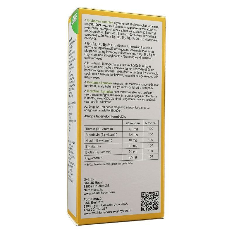 Napi 20 ml B-vitamin komplex szirup 100%-ban biztosítja a felnőtt szervezet számára a B1, B2, B3, B6, B7 és B12-vitaminokat.
