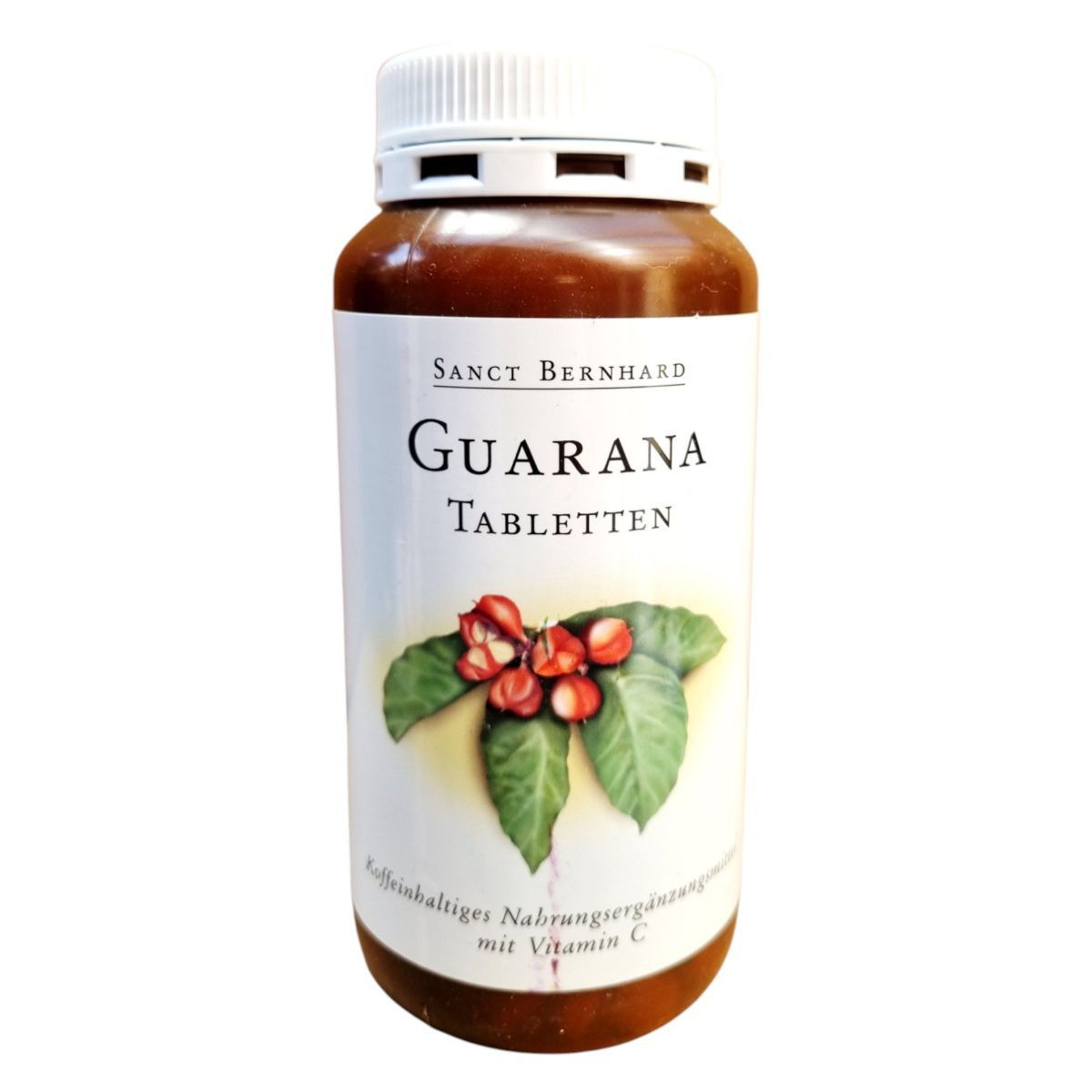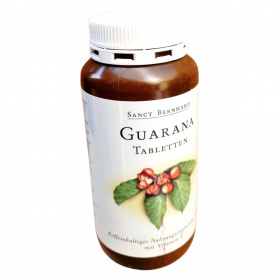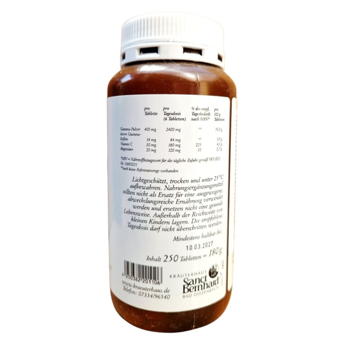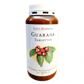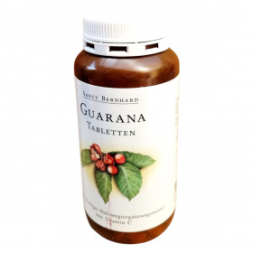 A SANCT BERNHARD Guarana tabletta egy étrend-kiegészítő, amely guaranát és C-vitamint tartalmaz. A guarana természetes koffeinforrás, amely hozzájárulhat az éberség fenntartásához és a fáradtság csökkentéséhez. A C-vitamin fontos szerepet játszhat az immunrendszer normál működésének támogatásában. A termék magnéziumot is tartalmaz, amely hozzájárulhat az izmok normál működéséhez. A tabletták napi háromszori fogyasztása ajánlott, étkezések előtt bő folyadékkal. A terméket hűvös, száraz helyen kell tárolni, és gyermekektől elzárva tartandó. A termék koffeint tartalmaz, ezért gyermekek és terhes nők számára nem ajánlott.