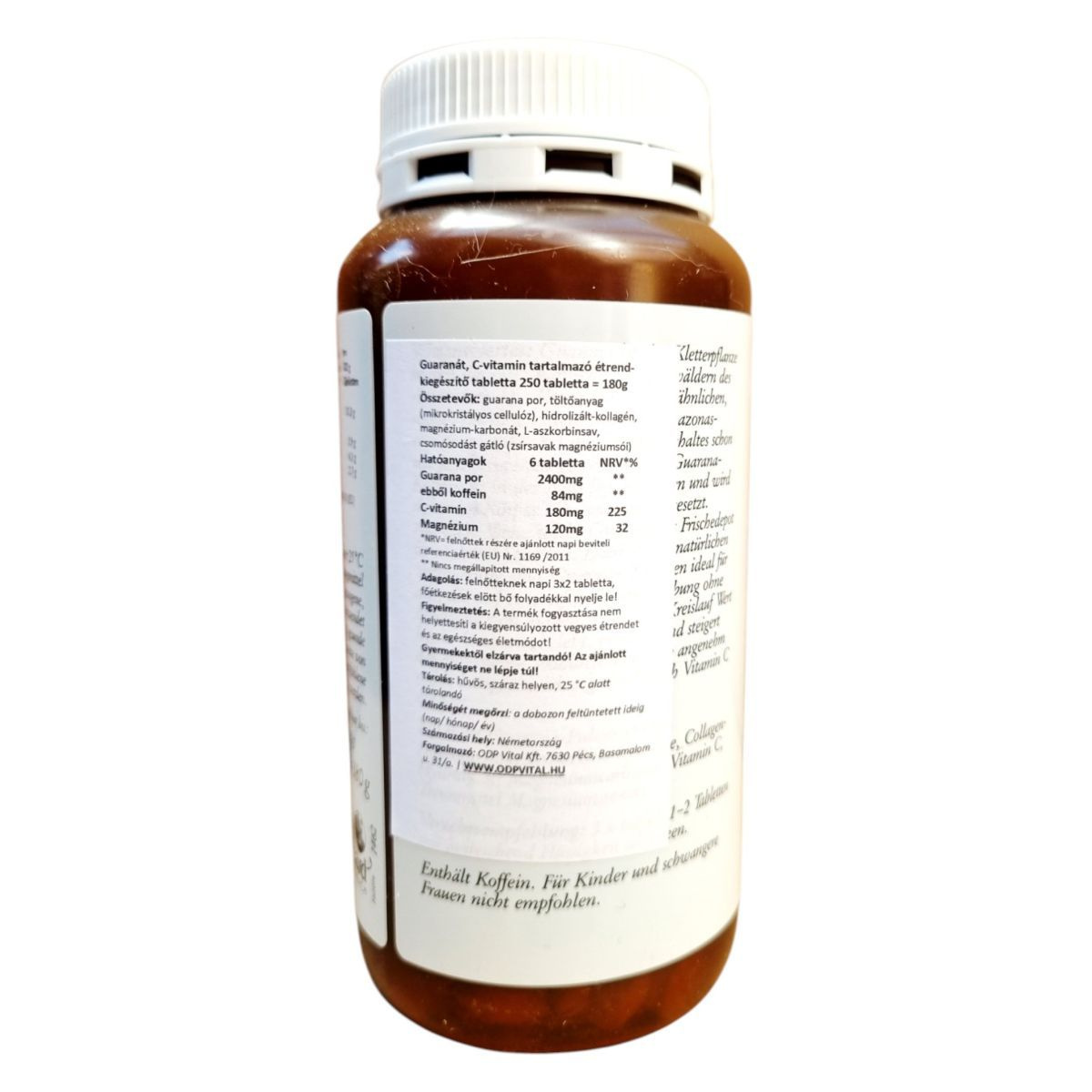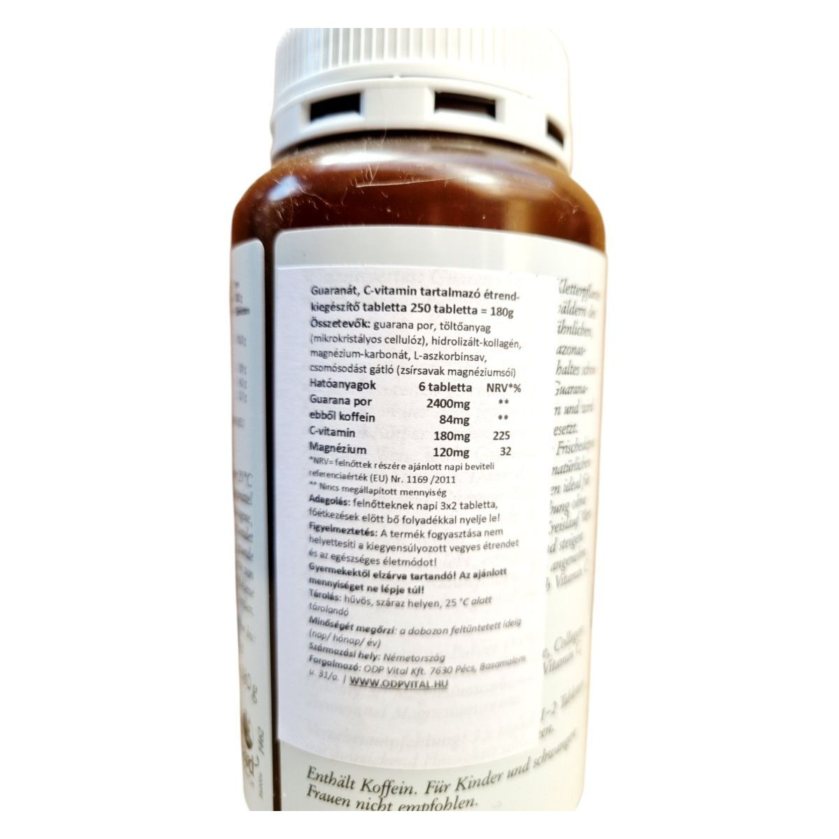 Ez a guaranát és C-vitamint tartalmazó étrend-kiegészítő tabletta koffeint is tartalmazhat, amely hozzájárulhat az éberség fenntartásához. A C-vitamin támogathatja az immunrendszer normál működését.
