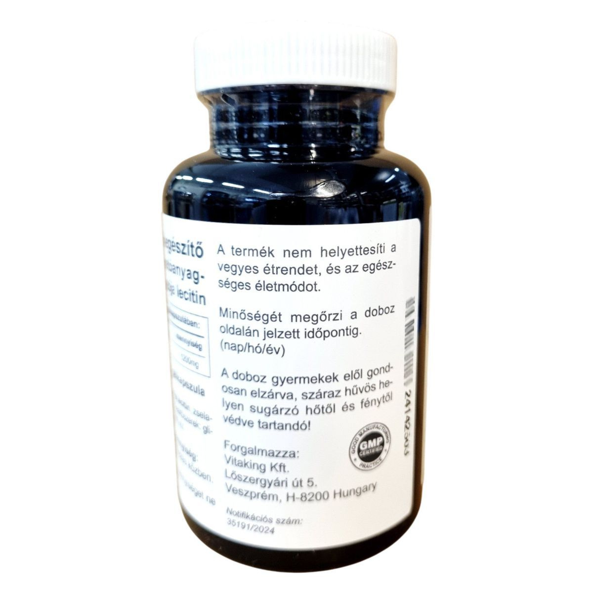 A Vitaking Szója Lecitin egy 1200 mg hatóanyag-tartalmú étrend-kiegészítő, amely 100 gélkapszulát tartalmaz. A termék fő összetevője a szója lecitin, amelyet zselatin kapszulahéj, glicerin, szorbit és tisztított víz egészít ki. A napi ajánlott mennyiség 1 gélkapszula, amelyet étkezés közben javasolt bevenni. Fontos, hogy a napi ajánlott mennyiséget ne lépje túl, és a termék nem helyettesíti a vegyes étrendet és az egészséges életmódot. A terméket száraz, hűvös helyen, sugárzó hőtől és fénytől védve kell tárolni, gyermekek elől elzárva. A Vitaking Kft. által forgalmazott termék notifikációs száma 35191/2024.