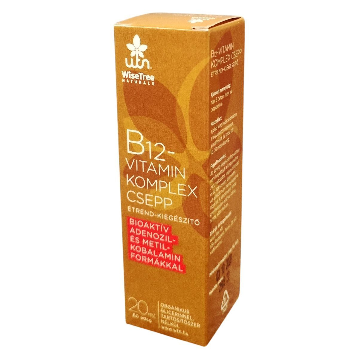 A WiseTree NATURALS B12-vitamin komplex csepp egy bioaktív adenozil- és metil-kobalamin formákat tartalmazó étrend-kiegészítő, amely organikus glicerinből készül, tartósítószer nélkül. A termék 20 ml-es kiszerelésű, és 60 adagot tartalmaz. A cseppet napi 6 cseppben javasolt alkalmazni, amelyet nyelv alá kell cseppenteni, majd körülbelül 30 másodpercig ott tartani a jobb felszívódás érdekében. Az összetevők között megtalálható a metil-kobalamin, az adenozil-kobalamin, valamint a 6(S)-L-metiltetrahidrofolát és inozitol-hexanikotinát is. A termék a B12-vitaminon kívül B9-vitamint is tartalmaz, amely L-5-MTHF formában van jelen. A készítményt a Wise Tree Kft. gyártja és forgalmazza. A termék fogyasztása nem helyettesíti a változatos, kiegyensúlyozott étrendet és az egészséges életmódot, továbbá fontos az ajánlott napi mennyiség betartása.
