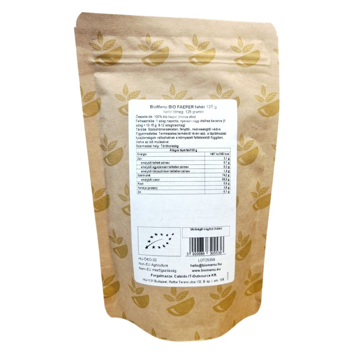A BioMenü BIO FAEPER fehér egy kiváló minőségű, 100% bio faeper termék, amely Törökországból származik. A termék organikus, nyers és vegán, így ideális választás azok számára, akik természetes és egészséges étrendet követnek. A termék 125 grammos kiszerelésben kapható, és napi egy adag fogyasztása ajánlott, amely nyersen vagy ételhez keverve is fogyasztható. A termék táplálkozási tulajdonságai változhatnak a környezeti feltételektől függően, ezért fontos a megfelelő tárolás. A termék HU-ÖKO-02 tanúsítvánnyal rendelkezik, és a Caleido IT-Outsource Kft. forgalmazza.