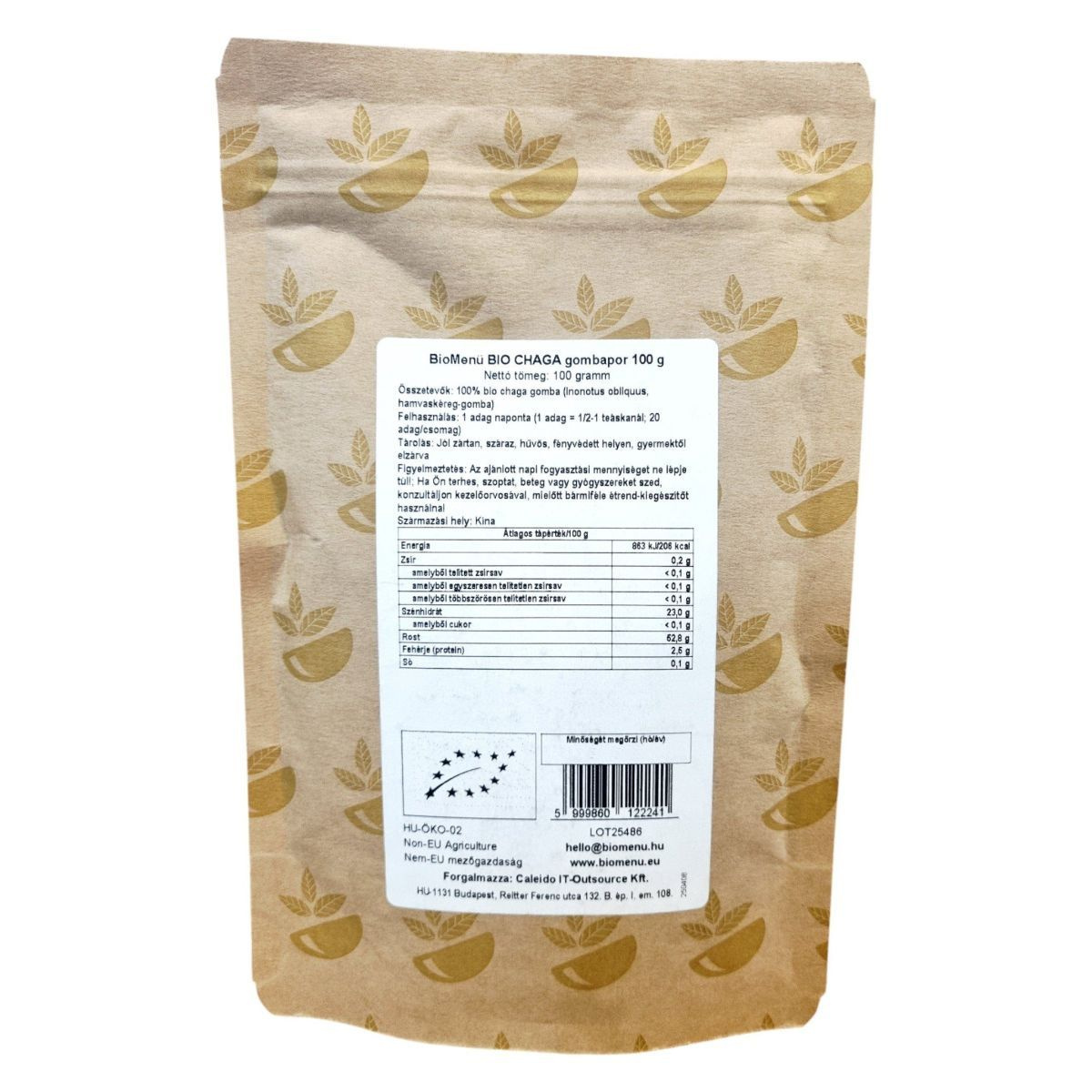 A BioMenü BIO CHAGA gombapor 100% tiszta, bio minőségű chaga gombából készül, amelyet Kínában termesztenek. A termék különösen gazdag rostokban, és alacsony zsír- és cukortartalmú. A chaga gomba antioxidáns hatású lehet, és támogathatja az immunrendszer működését. A termék megfelel a bio, raw és vegán étrendi irányzatoknak, és a HU-ÖKO-02 tanúsítvánnyal rendelkezik. A termék forgalmazója a Caleido IT-Outsource Kft., amely Budapesten található.