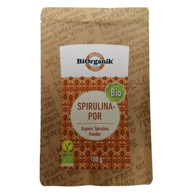 Bio spirulina por, amely természetes fehérjeforrásként és antioxidánsként támogatja a szervezetet.