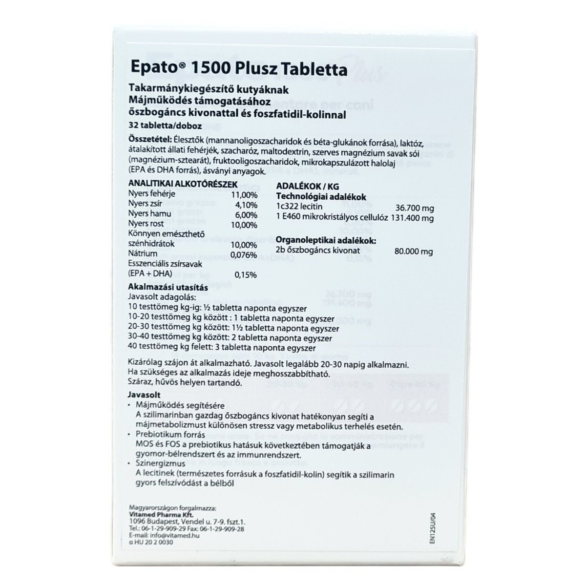 Az Epato 1500 Plus egy takarmánykiegészítő kutyák számára, amely májműködés támogatására készült. Fő hatóanyagai közé tartozik az őszbogáncs kivonat, mely szilimarinban gazdag, és hozzájárulhat a máj metabolizmusához, különösen stressz vagy metabolikus terhelés esetén. A termék a prebiotikumok – mannanoligoszacharidok (MOS) és fruktooligoszacharidok (FOS) – forrása, amelyek támogatják a gyomor-bélrendszert és az immunrendszert. A foszfatidil-kolin természetes forrásaként szolgáló lecitin segítheti a szilimarin gyors felszívódását a bélből. A készítmény 32 tablettát tartalmaz, amely 4 darab 8 tablettás blisztert foglal magában. Az Epato 1500 Plus kizárólag szájon át alkalmazható, és a javasolt adagolás a kutya testtömegétől függően változik. Az alkalmazás ideje legalább 20-30 nap, de szükség esetén meghosszabbítható. A termék olaszországi gyártású, Magyarországon a Vitamed Pharma Kft. forgalmazza.