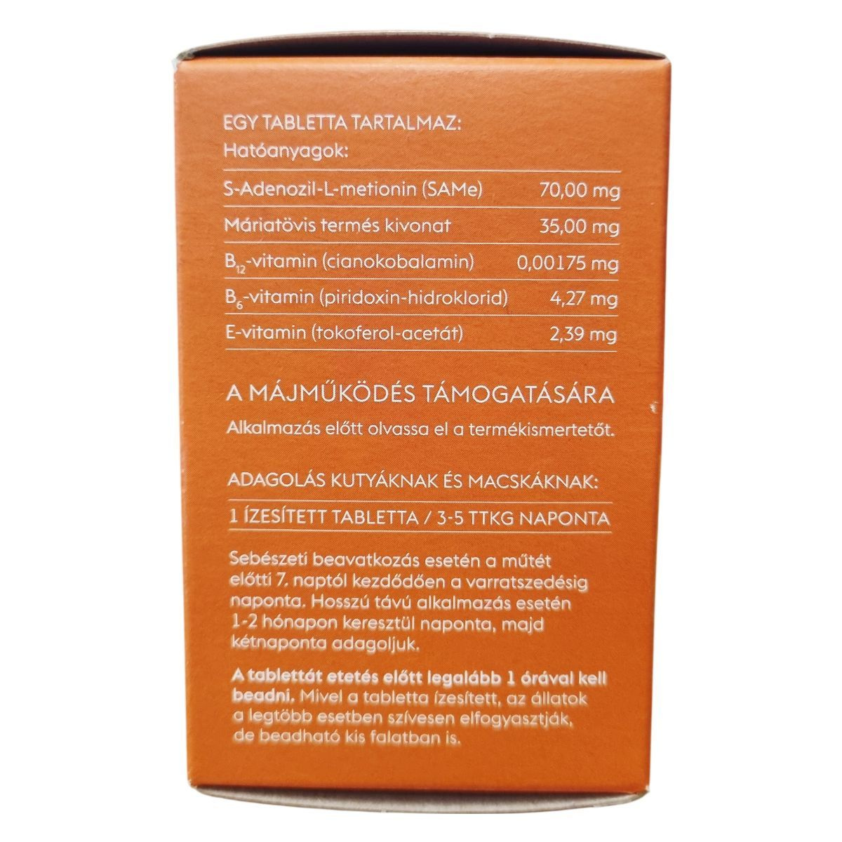 A Hepa-Pet+ ízesített tabletta állatgyógyászati készítmény különösen kutyák és macskák számára. A termék egy tablettájában több hatóanyag található, melyek májműködés támogatására szolgálnak. Ezek között szerepel az S-Adenozil-L-metionin (SAMe), a máriatövis termés kivonat, valamint B6-, B12- és E-vitaminok. A tablettákat általában a kistestű kutyáknak és macskáknak napi egy darabban ajánlják, nagyobb kutyáknak pedig több darabban, testsúlytól függően. Sebészeti beavatkozás esetén a műtét előtti 7. naptól a varratszedésig naponta adható, hosszú távú használatnál 1-2 hónapig naponta, majd kétnaponta adagolható. A tablettát etetés előtt legalább egy órával javasolt beadni, és ízesített volta miatt a legtöbb állat szívesen elfogyasztja. A termék kizárólag állatok részére készült, gyermekek elől elzárandó, és száraz, hűvös helyen célszerű tárolni.