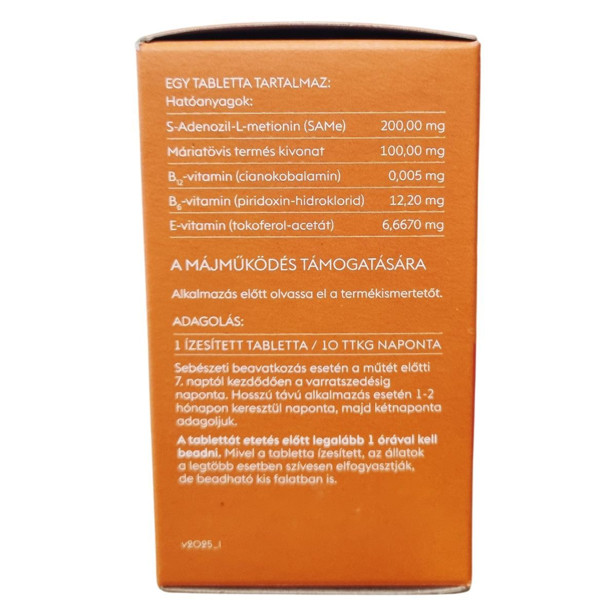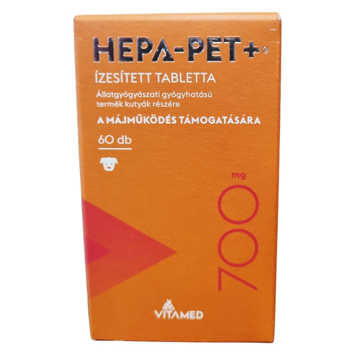 A HEPA-PET+® ízesített tabletta állatgyógyászati gyógyhatású termék kutyák számára, mely a májműködés támogatására készült. Egy tabletta 700 mg-os, és tartalmaz olyan hatóanyagokat, mint a S-Adenozil-L-metionin (SAMe), máriatövis termés kivonat, továbbá B-vitaminokat és E-vitamint. A terméket főként a műtéti beavatkozás előtti napoktól a varratszedésig, illetve hosszú távon is javasolhatják. A tabletták ízesítettek, ezért az állatok általában szívesen elfogyasztják, de szükség esetén kis falatban is beadható. A termék kizárólag állategészségügyi vagy állatápolási célra szolgál, gyermekektől elzárva kell tartani. A dobozon fel van tüntetve a gyártási szám és egyéb fontos információk.