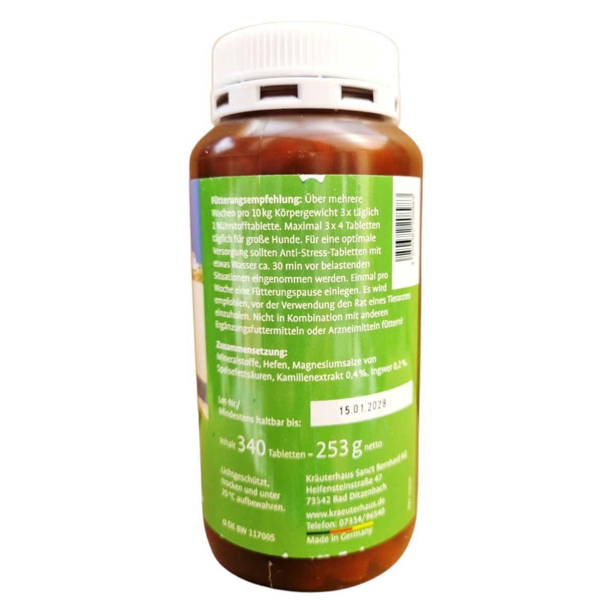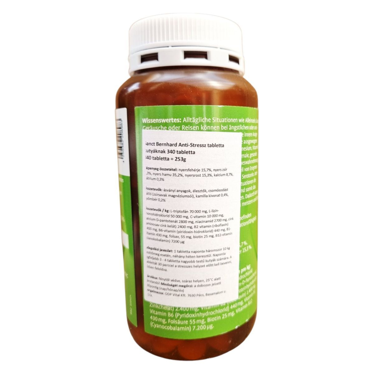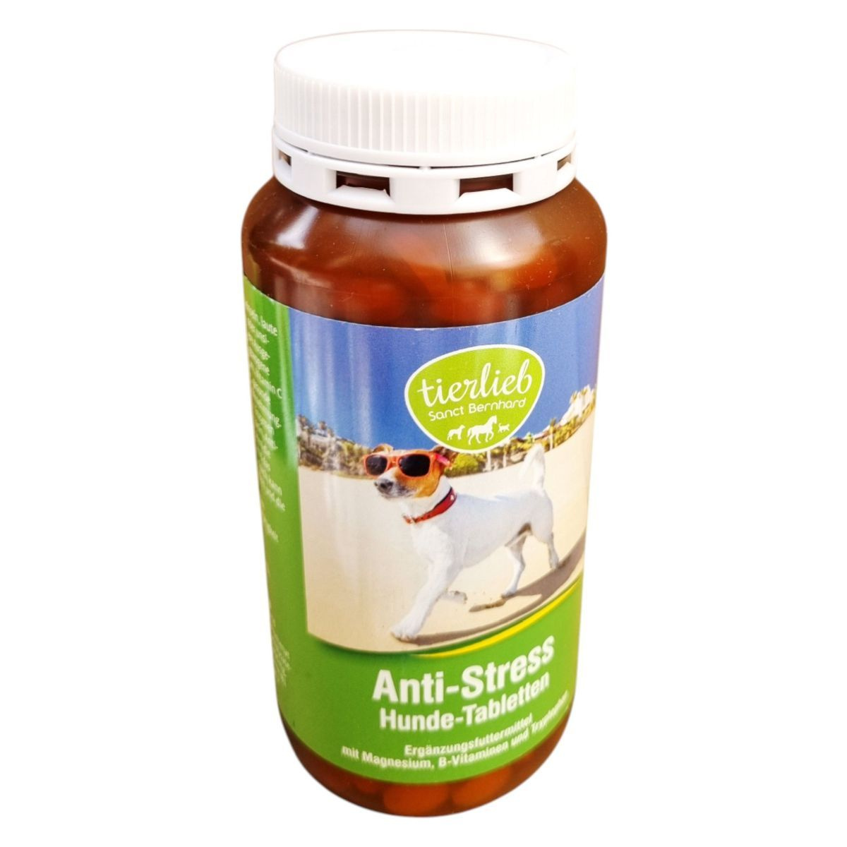 A Sanct Bernhard Anti-Stressz tabletta kutyáknak kifejlesztett étrend-kiegészítő, amely magnéziumot, B-vitaminokat és triptofánt tartalmaz. Ezek az összetevők hozzájárulhatnak a stresszes helyzetek kezeléséhez, mint például az egyedüllét, zajok vagy utazás. A termék kamilla és gyömbér kivonatot is tartalmaz, amelyek szintén támogathatják a nyugodt viselkedést. A tabletták adagolása testtömeg alapján történik, és javasolt a stresszes helyzet előtt fél órával beadni. A termék használata előtt ajánlott állatorvosi konzultáció, és nem javasolt más étrend-kiegészítőkkel vagy gyógyszerekkel együtt alkalmazni.