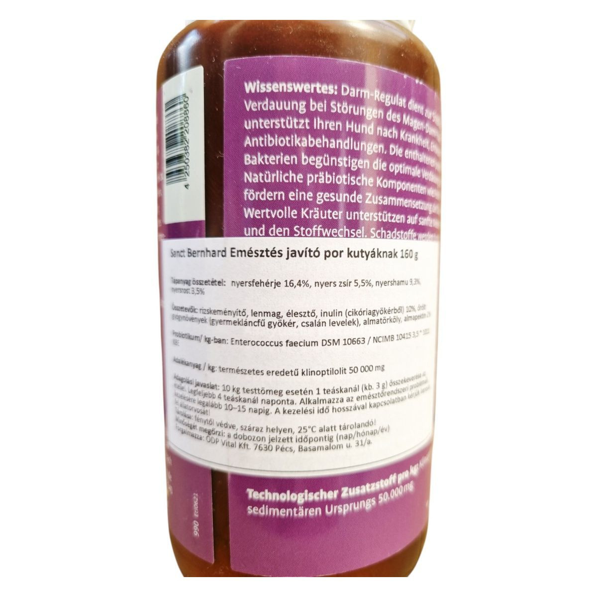 A Sanct Bernhard Emésztés javító por kutyáknak egy probiotikus diétás kiegészítő, amely segíthet a kutyák emésztésének stabilizálásában, különösen emésztési zavarok esetén. A termék probiotikus baktériumokat tartalmaz, amelyek elősegíthetik az optimális emésztést, valamint természetes prebiotikus összetevőket, mint az inulin, amelyek támogathatják a bélflóra egészséges összetételét. A termék gyógynövényeket is tartalmaz, amelyek gyengéden támogathatják az emésztést és az anyagcserét. A termék használata előtt vagy a használati idő meghosszabbítása előtt ajánlott állatorvossal konzultálni. Tárolása fénytől védve, száraz helyen, 25°C alatt javasolt.