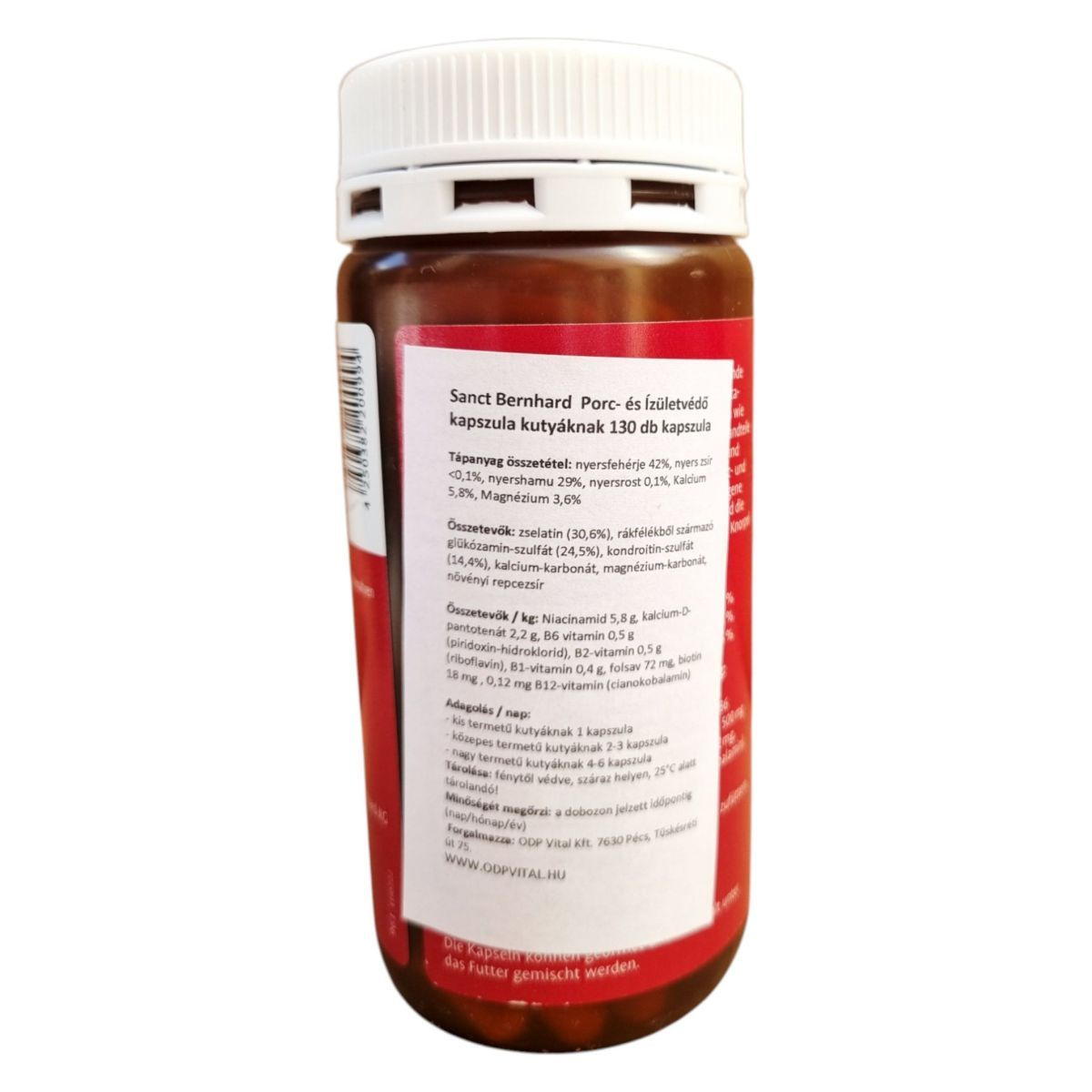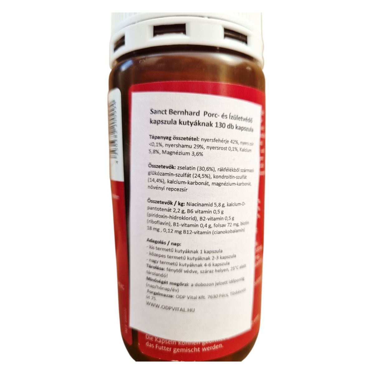 A Sanct Bernhard Porc- és Ízületvédő kapszula kutyáknak készült, hogy támogassa az ízületek egészségét. A termék glükozamin-szulfátot és kondroitin-szulfátot tartalmaz, amelyek hozzájárulhatnak az ízületek rugalmasságához és egészségéhez. A kapszulák továbbá fontos vitaminokat és ásványi anyagokat is tartalmaznak, mint például niacinamid, kálcium-D-pantotenát, B-vitaminok, folsav és biotin. A termék használata különösen ajánlott azoknak a kutyáknak, akiknek ízületi problémáik lehetnek. A kapszulákat könnyű adagolni, és különböző méretű kutyák számára is megfelelő adagolási útmutatót biztosítanak.