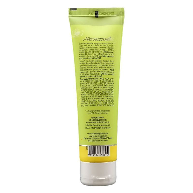 Bőrkímélő felületaktív anyagai hatékonyan tisztítják a zsíros, aknés bőrt is. A paradicsom kivonata, a ciprus illóolaja, a panthenollal és E-vitaminnal a faggyúmirigy működés normalizálását támogatja. A bőrfelület hidratáltságának megőrzését segíti. Alkalmazás: a nedves bőrfelületre 1 cm3-t felkenünk, majd bő vízzel leöblítjük 1-2 percen belül! A 3 év alatt gyermekek nem használhatják!