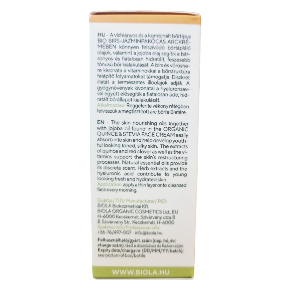 A Biola Bio Birs-Jázminpakócás arckrém biológiailag ellenőrzött ökológiai és biodinamikus termelésből származó összetevőket használ, amelyek támogatják a bőr szerkezetének megújulását és hidratáltságát. A természetes, bőrtápláló olajok és gyógynövény-kivonatok, mint a birs és vöröshere, valamint a jojoba olaj együttesen segítik a bőr bársonyos, fiatalos megjelenését. A hyaluronsav és természetes illóolajok finom illatot és hosszan tartó hidratálást biztosítanak. A termék különösen alkalmas kombinált, szeborreás és vízhiányos bőr ápolására, nem tartalmaz méhészeti eredetű apiterápiás összetevőket, így széles körben használható, természetes bőrápolóként.