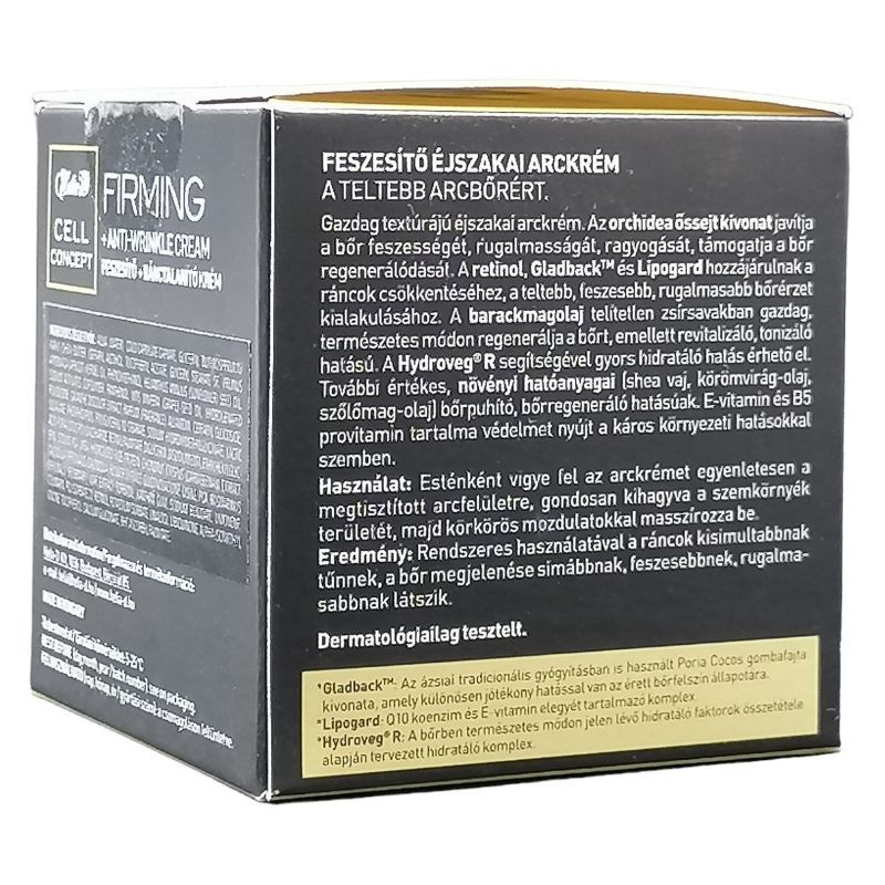 Gazdag textúrájú feszesítő éjszakai arckrém teltebb arcbőrért. Az orchidea őssejt kivonat javítja a bőr feszességét, rugalmasságát, ragyogását és támogatja a regenerálódását. A retinol, a Gladback™ és a Lipogard hozzájárulhatnak a ráncok csökkentéséhez és a bőr teltségének, feszességének javításához. A barackmagolaj telítetlen zsírsavakban gazdag, természetes módon regenerálja a bőrt, revitalizáló és tónizáló hatású. A Hydrovég® R gyors hidratáló hatást biztosít. A további növényi hatóanyagok – shea vaj, körömvirág-olaj és szőlőmag-olaj – bőrpuhító és bőrregeneráló hatásúak. Az E-vitamin és a B5 provitamin védelmet nyújtanak a káros környezeti hatásokkal szemben. Rendszeres használat mellett a ráncok mélysége csökkenhet, a bőr simábbnak, feszesebbnek és rugalmasabbnak látszik. Dermatológiailag tesztelt. Made in Hungary.