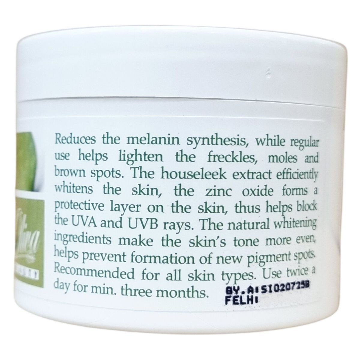 A krém csökkenti a melanin szintézist, így rendszeres használat mellett hatékonyan halványítja a szeplőket, májfoltokat és a túlzott pigmenttermelésből adódó barna foltokat. A kövirózsa kivonat hatékonyan világosítja a bőrt, míg a cink-oxid védőréteget képez a bőr felszínén, amely visszaveri az UVA és UVB sugarakat. A természetes fehérítő összetevők elősegítik a bőr tónusának egységesítését és segítenek megelőzni az új pigmentfoltok kialakulását. A termék minden bőrtípusra ajánlott.
