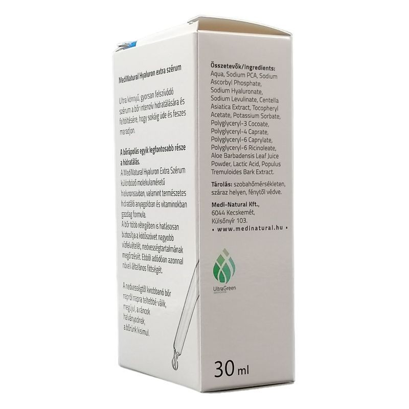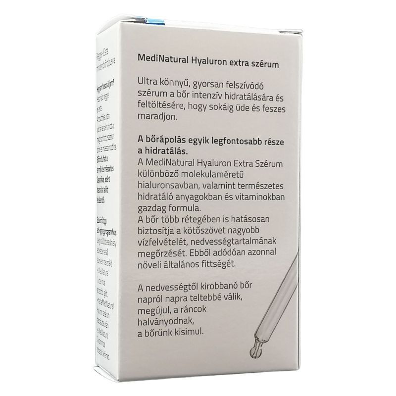 A MediNatural hyaluron extra szérum ultra könnyű, gyorsan felszívódó szérum, a bőr intenzív hidratálására és feltöltésére, hogy az sokáig üde és feszes maradjon. Természetes alapanyagokból álló bőrfiatalító MediNatural hyaluron extra szérum, mely azonnali hidratáltságot és rugalmasságot kölcsönözhet a bőrnek különlegesen magas hyaluronsav- és vitamintartalmának köszönhetően.