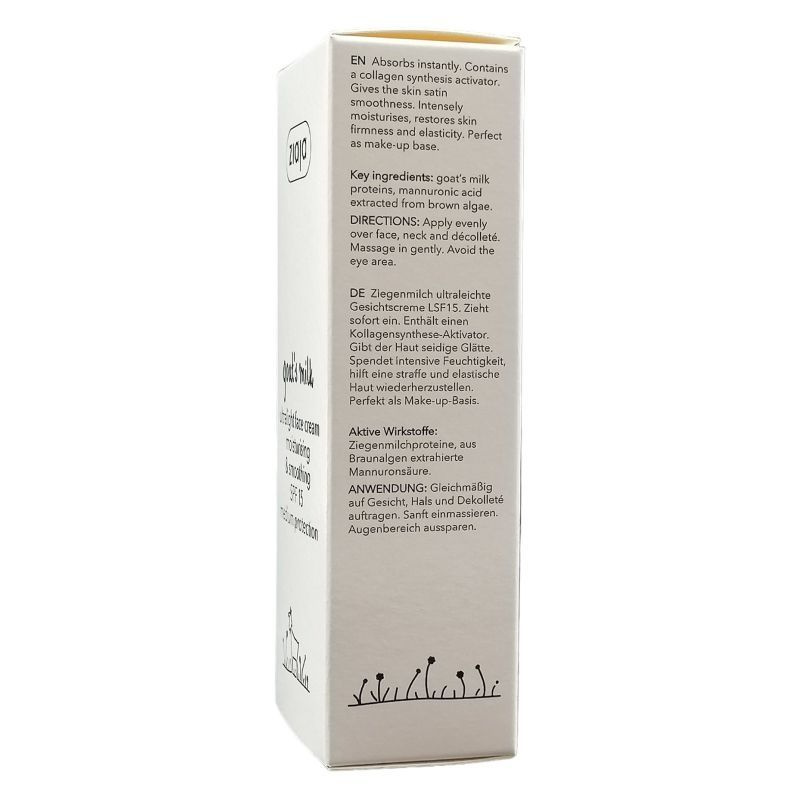Azonnal a bőrbe szívódik, nem hagy zsíros érzetet a bőrön. Kollagén szintézist aktiváló összetevőt tartalmaz. Az arcbőrt selymesen puhává varázsolja. Intenzíven hidratál, visszaállítja a bőr feszességét és rugalmasságát. Megvédi a bőrt a napfény káros UV-sugárzásától. Nyugtatja az irritált bőrt. Finom illatának és könnyű állagának köszönhetően frissesség érzetet nyújt. Tökéletesen használható sminkalapnak is. Kecsketej proteinek, barna algából kivont mannuronsav származék, E-vitamin.