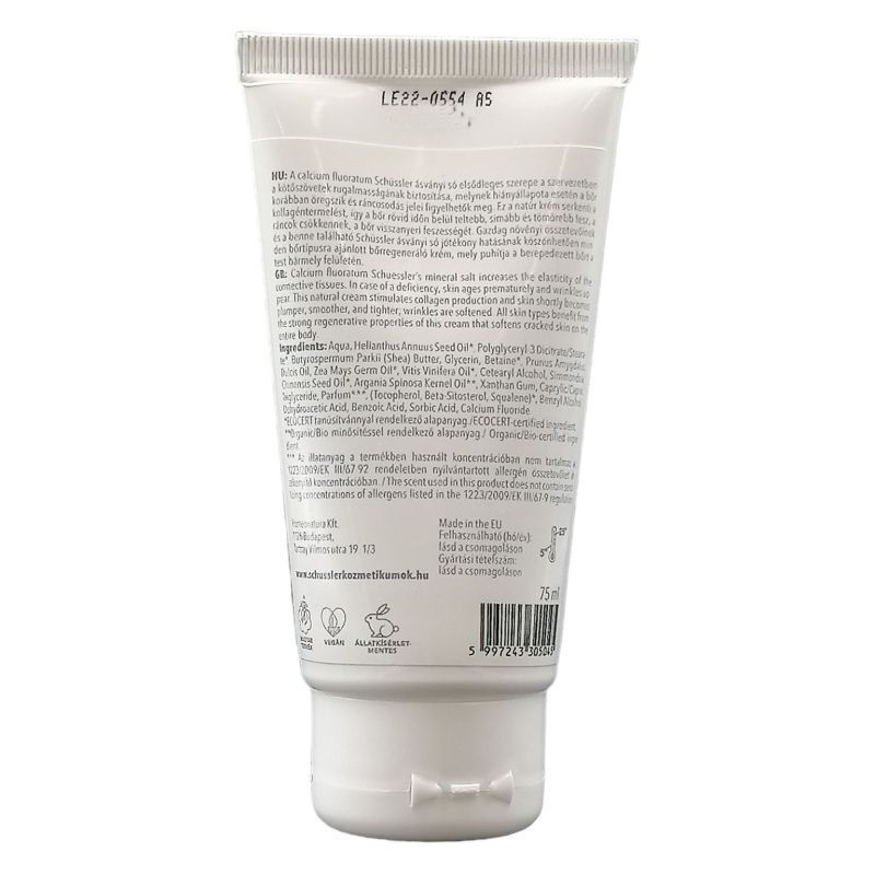 Természetes bőrtápláló hatóanyagokban gazdag, emellett a kötőszöveteket erősítő, a kollagéntermelést fokozó, calcium fluoratum Schüssler ásványi só teszi még hatékonyabbá. Használhatod arcra, testre egyaránt.