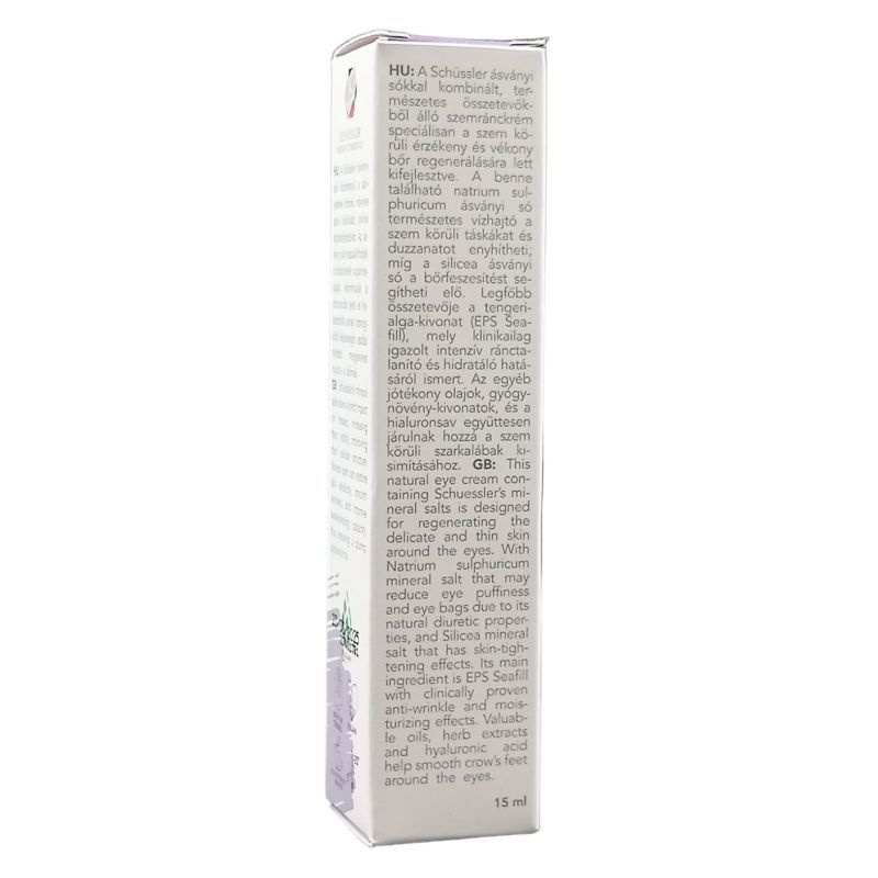 Ez a Schüssler Age Protection szemránckrém speciálisan a szemkörnyék területre kifejlesztett natúr krém. Különleges ásványi sókkal segít megszüntetni a reggeli szem körüli puffadást és a szemkörnyéki szarkalábakat. Könnyű állaga miatt gyorsan beszívódik és friss érzést hagy a bőrön. Mivel a szemkörnyék vékony bőre gyorsabban kiszárad, könnyebben megnyúlik, a szárazság okozta ráncok jobban láthatóvá válnak. Ez a terület kevesebb kollagént és elasztikus rostot tartalmaz, ami megőrizhetné a feszességet és a rugalmasságot.