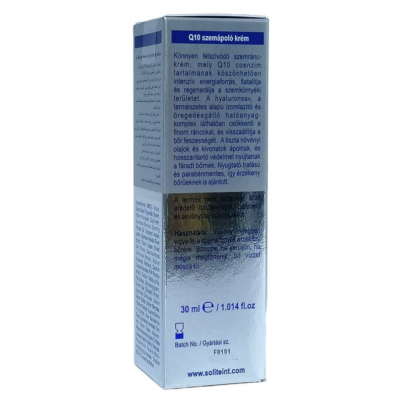 A Q10 koenzim tartalomnak köszönhetően intenzív energiaforrást biztosít. Hatására a szemkörnyéki terület felélénkül és regenerálódik. A magas hialuronsav tartalom és az egyéb vízmegkötő anyagok mélyrehatóan hidratálnak. Az Acmella (népiesen zsibbasztófű) kivonat felületaktív öregedésgátló és természetes alapú izomlazító hatóanyaga láthatóan csökkenti a finom ráncokat. A korszerű hatóanyag komplexek visszaállítják a bőr feszességét és erősítik a rugalmas rostokat.