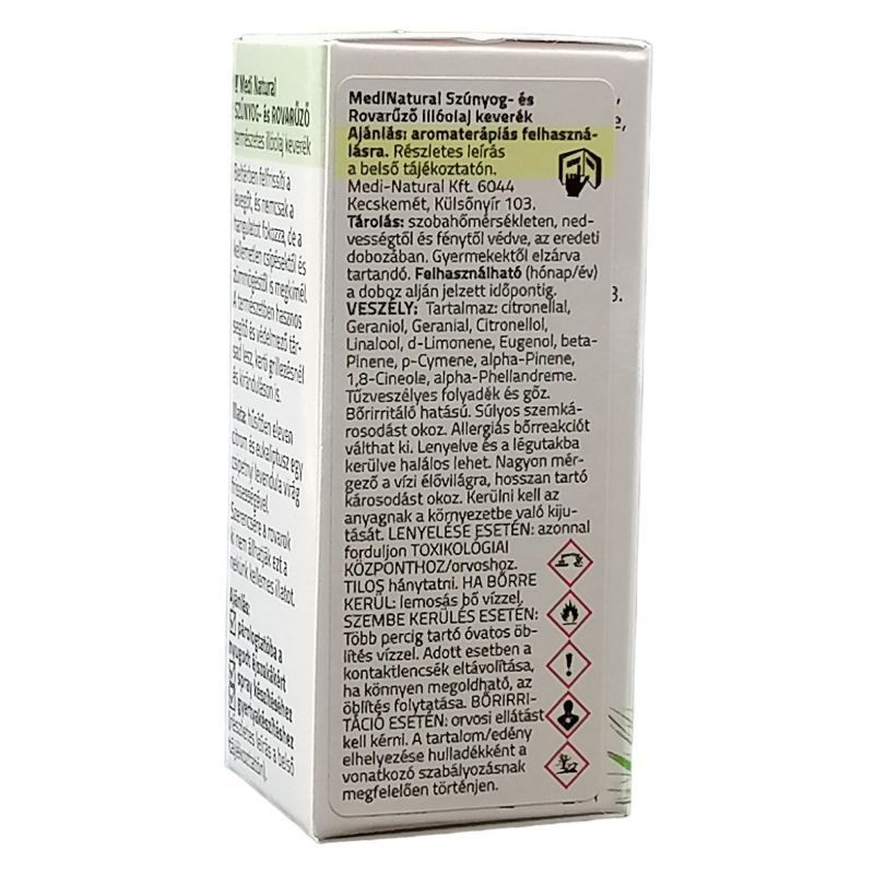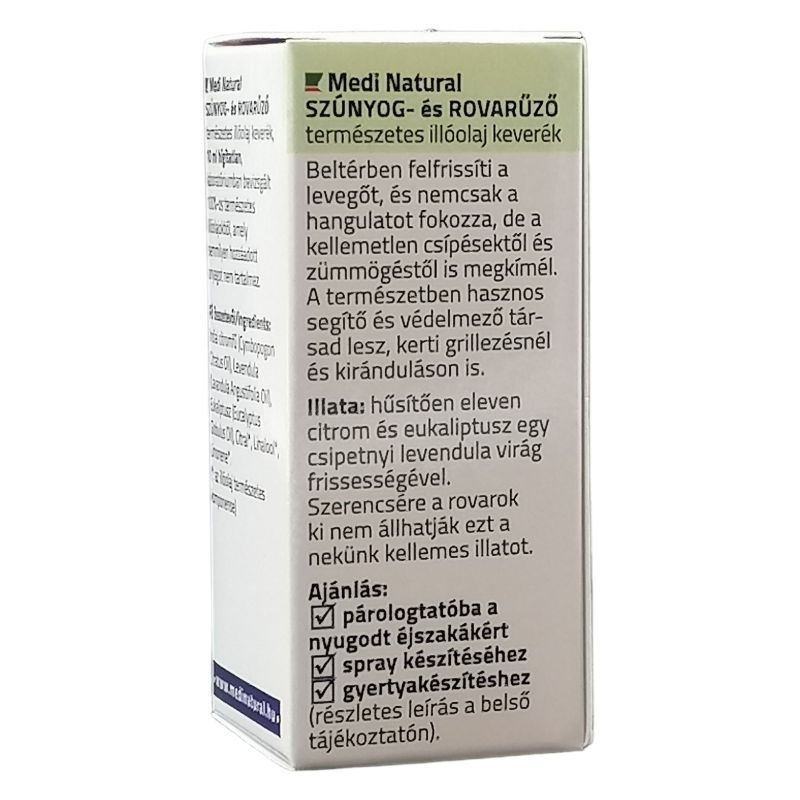 Szerencsére a rovarok ki nem állhatják ezt a nekünk egyébként kellemes illatot. A természetben hasznos segítő és védelmező társad lesz kerti grillezésnél, kirándulásoknál. Téged is imádnak a kis vérszívó szúnyogok, és semmi kedved osztozkodni velük a lakásodon? Akkor ez a természetes illóolaj keverék Neked készült. Nem kell, hogy a rovarcsípés elleni védekezés azt jelentse, hogy mérgező, irritáló anyagokat keljen elviselned. A MediNatural Szúnyog és Rovarűző illóolaj keverék hatóanyagait kizárólag 100%-os természetes illóolajok alkotják.