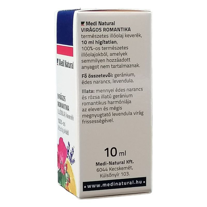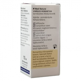 A MediNatural Virágos romantika természetes illóolaj keverék illata egyszerűen mennyei! Édes narancs és rózsa illatú geránium romantikus harmóniája az eleven és mégis megnyugtató levendula virág frissességével. A MediNatural Virágos Romantika természetes illóolaj keverék a következő 100%-os Medinatural illóolajokból komponáltuk meg számodra! Narancs (Citrus Aurantium Dulcis Peel Oil), Geránium (Pelargonium odorantissimum oil), Levendula (Lavandula angustifolia oil).