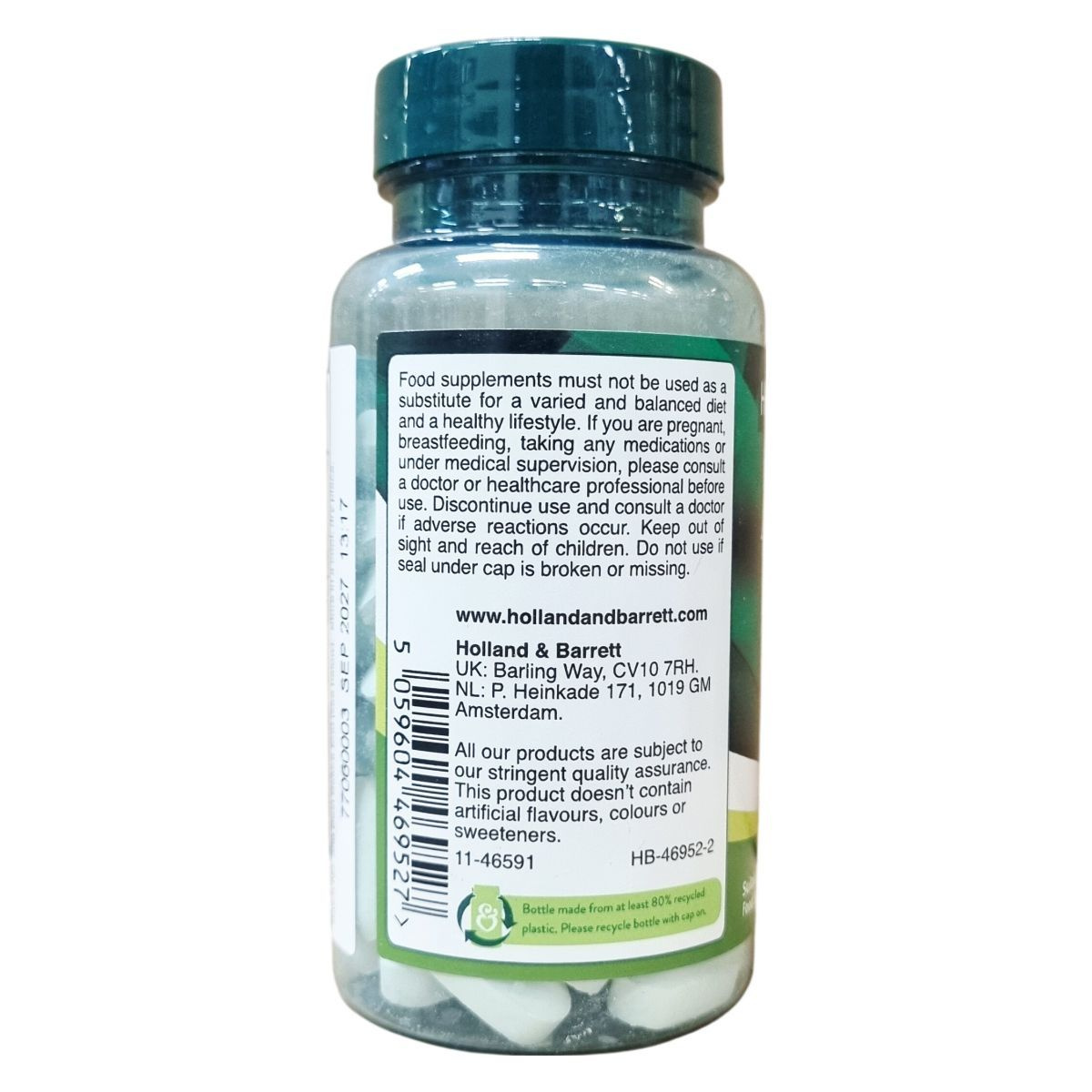A termék nettó tömege 99 g, ami 90 tablettának felel meg, azaz 45 adag. Az étrend-kiegészítő nem tartalmaz mesterséges ízesítőket, színezékeket vagy édesítőszereket, és csomagolása legalább 80% újrahasznosított műanyagból készül. Az üveget kérjük, a kupakkal együtt újrahasznosítsa. A termék az Egyesült Királyságból származik, és szigorú minőségbiztosítási eljárásokon megy keresztül. Használat előtt kérjük, olvassa el a biztonsági előírásokat, és vegye figyelembe, hogy az étrend-kiegészítők nem helyettesítik a változatos és kiegyensúlyozott étrendet és az egészséges életmódot.