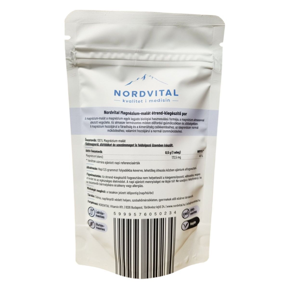 A Nordvital Magnézium-malát étrend-kiegészítő por a magnézium egyik legjobban hasznosuló formáját kínálja, amely almasavval alkotott vegyületként természetes módon fordul elő gyümölcsökben és zöldségekben. A termék 180 adagot tartalmaz, és napi 0,5 gramm fogyasztása ajánlott. A magnézium hozzájárulhat a fáradtság és kimerültség csökkentéséhez, valamint az idegrendszer és az izmok normál működéséhez. A termék vegán, GMO-mentes, gluténmentes és laktózmentes, így széles körben alkalmazható különböző étrendi igények kielégítésére.