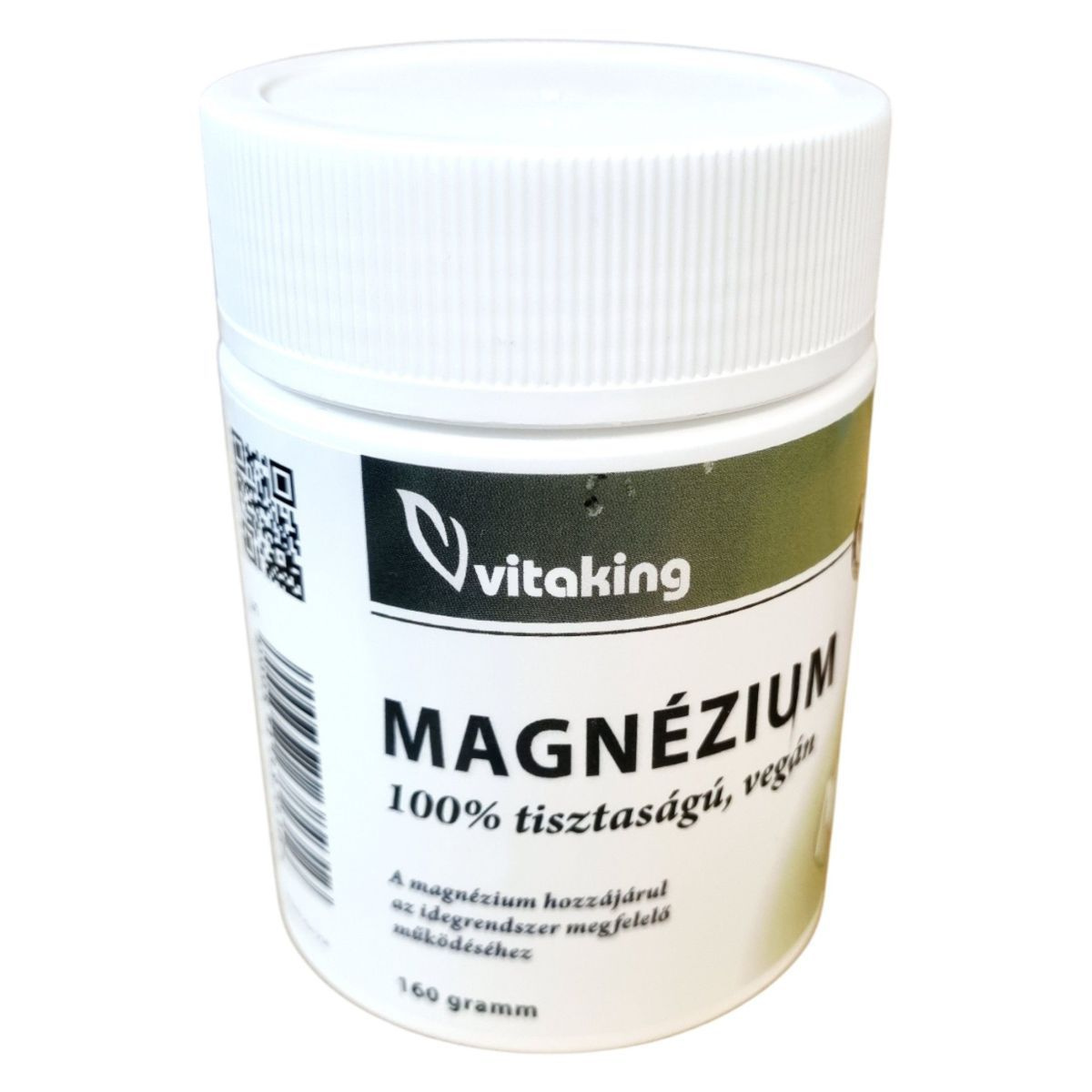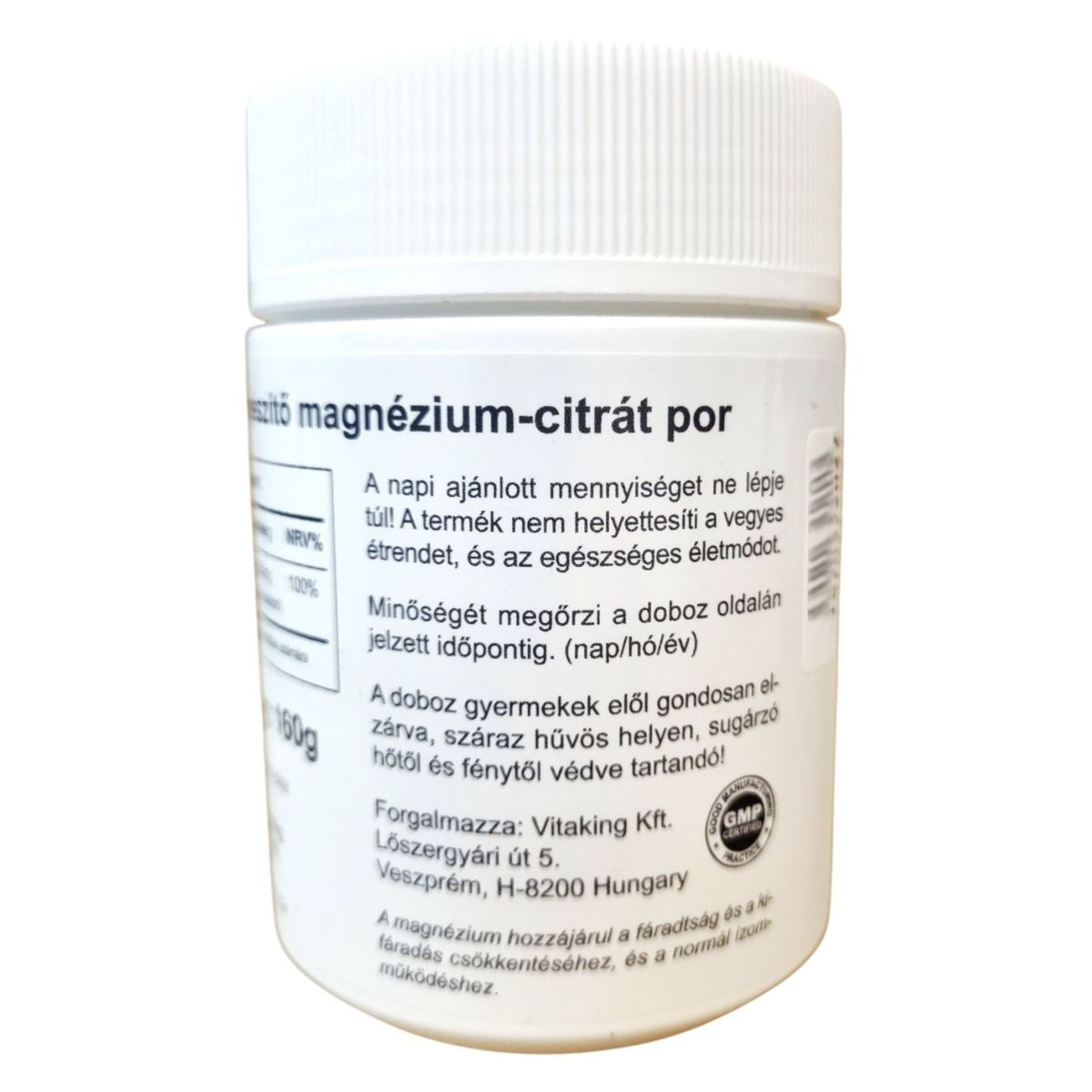 A Vitaking Magnézium egy 100% tisztaságú, vegán étrend-kiegészítő, amely magnézium-citrát formájában biztosítja a szükséges magnéziumbevitelt. A termék hozzájárulhat az idegrendszer megfelelő működéséhez, a fáradtság és kifáradás csökkentéséhez, valamint a normál izomműködés fenntartásához. A termék 160 grammos kiszerelésben kapható, és a napi ajánlott mennyiség 3 csapott adagolókanál. Fontos, hogy a terméket gyermekek elől elzárva, száraz, hűvös helyen tároljuk, és ne lépjük túl az ajánlott napi mennyiséget. A termék forgalmazója a Vitaking Kft., és a notifikációs száma 33685/2024.
