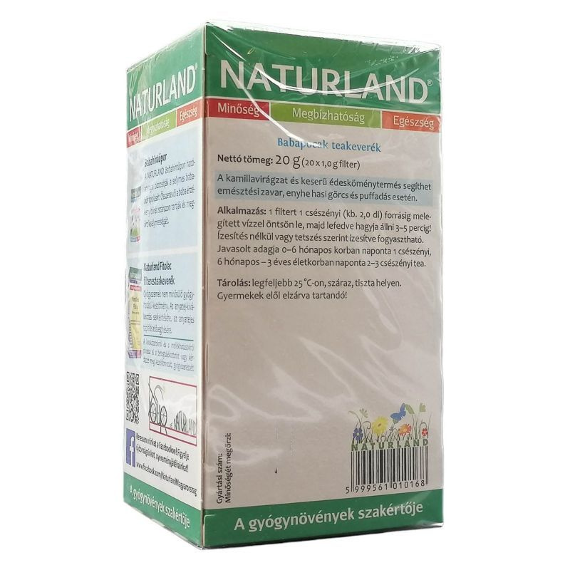 Újszülött kortól alkalmazható. Összetevők: kamillavirágzat, keserű édeskömény termés. A gyógynövény legértékesebb részéből. Nem tartalmaz koffeint. Használati javaslat: Egy csészébe tegyen 1 filtert, öntsön rá 2,0-2,5 dl forró vizet, majd lefedve hagyja állni 3-5 percig! Ízesítés nélkül vagy tetszés szerint ízesítve fogyasztható. Javasolt adagja 0-6 hónapos korban naponta 1 csészényi, 6 hónapos - 3 éves életkorban naponta 2-3 csészényi tea. Figyeljen oda a változatos, kiegyensúlyozott táplálkozásra és az egészséges életvitelre! Tárolás: legfeljebb 25°C-on, száraz, tiszta helyen. Összetevők: kamillavirágzat, keserű édeskömény termés. Nettó tömeg: 20 g (20 x 1,0 g filter).