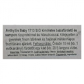 Ez az Anthyllis speciális tisztítószer tökéletes a babák érzékeny bőrére és hajára. A búzaprotein, a hibiszkusz kivonat és a további biológiai összetevők kellemes fürdőélményt biztosítanak. Biológiai termesztésből származó olívaolaj, nem tartalmaz szappant, színezék mentes, bőrgyógyászatilag tesztelt.