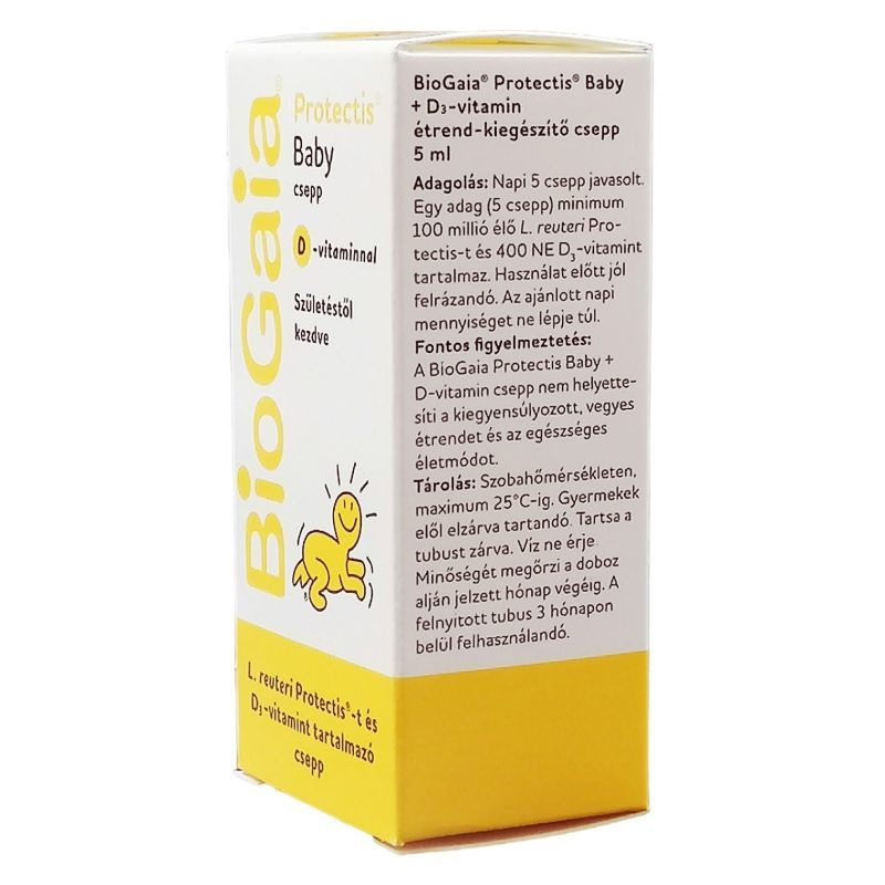 Adagolás: Napi 5 csepp javasolt. Egy adag (5 csepp) minimum 100 millió élő Lactobacillus reuteri Protectis-t és 400 NE D3-vitamint tartalmaz. Használat előtt jól felrázandó. Az ajánlott napi mennyiséget ne lépje túl.