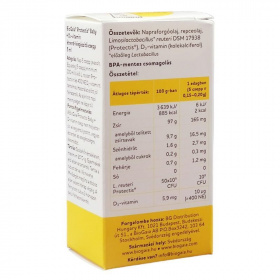 1 adagban (5 csepp=0,15-0,20 g): energia 6,2 kJ/1,5 kcal, zsír 164,3 mg, amelyből telített zsírsavak 78,6 mg, szénhidrát 7,4 mg, amelyből cukrok <0,8 mg, fehérje 1,17 mg, só <0,15 mg, D3-vitamin 10mg (=400 NE), L. reuteri Protectis 108 CFU