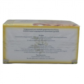 1 filter hatóanyag tartalma: 0.5 g kamillavirágzat (Matricariae flos), 0.5 g édeskömény-termés (Foeniculi dulcis fructus). A teakeverék nem tartalmaz egyéb ízesítő- és színezőanyagokat, tartósítószert. A készítmény bármely alkotórésze iránti túlérzékenység esetén. Egyéb fészkesvirágú fajok (pl. gyermekláncfű, fekete üröm, cickafark) iránti túlérzékenység esetén, mivel a kamillavirágzat és más fészkesvirágú fajok között keresztérzékenység lehetséges. A teakeverék fogyasztása bármely életkorban ajánlható. Népgyógyászati tapasztalatok szerint már csecsemőkorban alkalmazható, pl. a hasfájás, bélgázosság tüneteinek kezelésére. A teakeverék összetevőinek hatására javulnak az emésztési problémákból, csökkent bélmobilitás miatt jelentkező kellemetlen tünetek. Görcsoldó, gyulladáscsökkentő valamint emésztést elősegítő komponensei révén, a teakeverék fogyasztása a puffadtság érzetet is mérsékli. A tea fogyasztásakor az ilyen jellegű panaszai enyhülnek. Segíti a normál bélműködés fenntartását. Amennyiben a panaszok 2 - 3 órán belül nem szűnnek meg, forduljon orvoshoz. Tudnia kell, hogy kezelendő problémái milyen eredetűek. Amennyiben bizonytalan a tünetek okában, kérjük forduljon orvosához vagy gyógyszerészéhez panaszával. A javasolt adagolásban más szerekkel (gyógyszerekkel) való kölcsönhatása jelenleg nem ismert. 0 - 6 hónapos korig napi egy teafiltert, 6 hónapostól 3 éves korig napi 2 - 3 teafiltert, 3 éves kor feletti gyerekek és felnőttek esetében napi 3 - 5 x 1 teafiltert 3 - 5 dl forrásig melegített vízzel leforrázni, majd lefedve 5 - 10 percig állni hagyni. A filter eltávolítása után egyéni ízlés szerint fogyasztható. Igen ritkán a kamillával szemben túlérzékenységi reakciók kialakulhatnak. Ha bármilyen nem várt hatást észlel, forduljon orvosához vagy gyógyszerészéhez. Minden gyógyhatású készítménynek lehet nem kívánt hatása, még előírásszerű alkalmazás esetén is. A teakeverék fogyasztása megszakítás nélkül legfeljebb 2 - 3 hétig ajánlható.