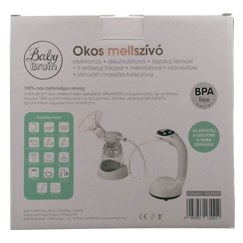 BabyBruin okos elektromos mellszívó, BPA mentes széles szájú cumisüveggel, érintőképernyős kijelzővel, beépített, újratölthető akkumulátorral, 9 erősségi fokozattal.